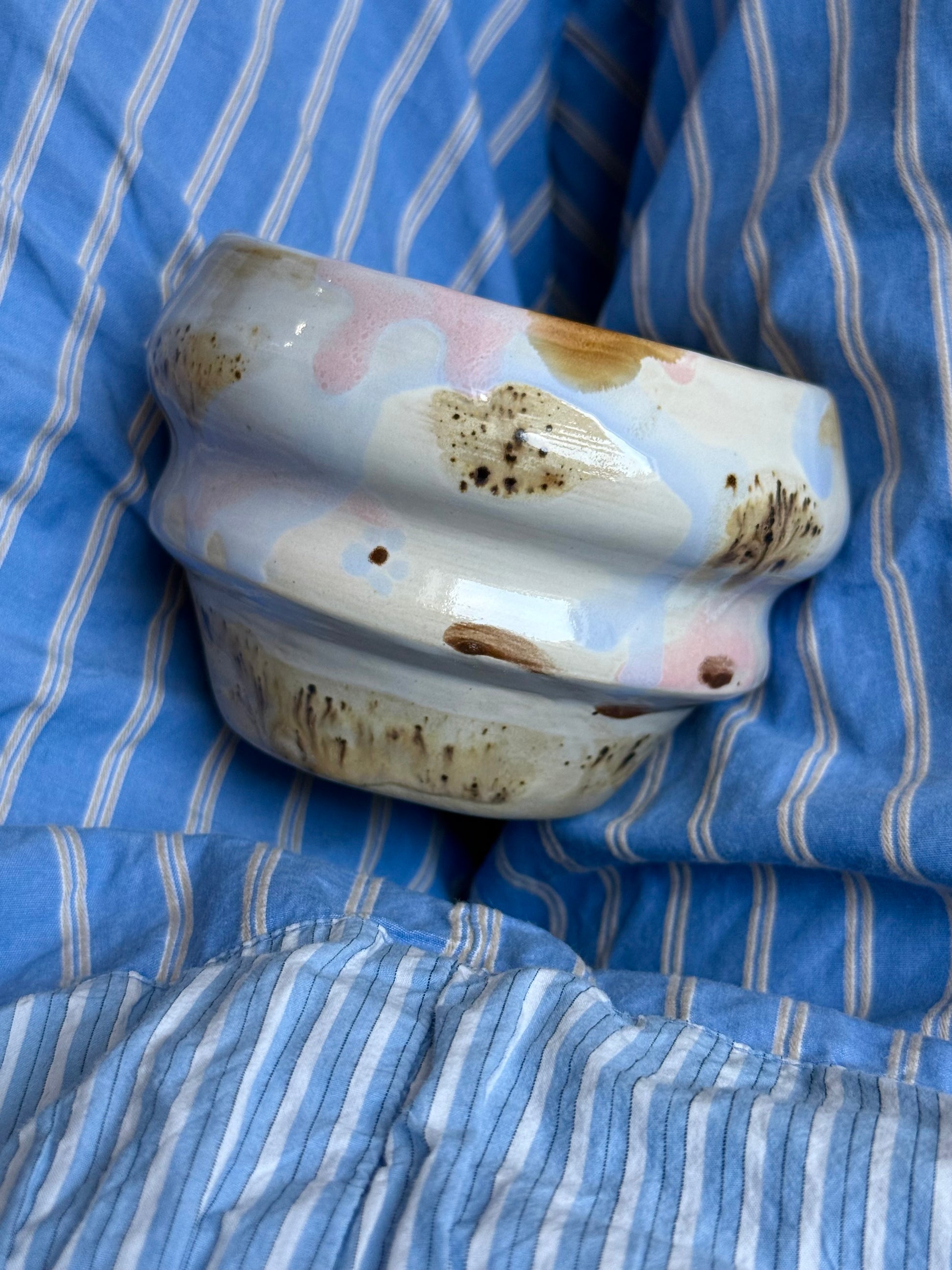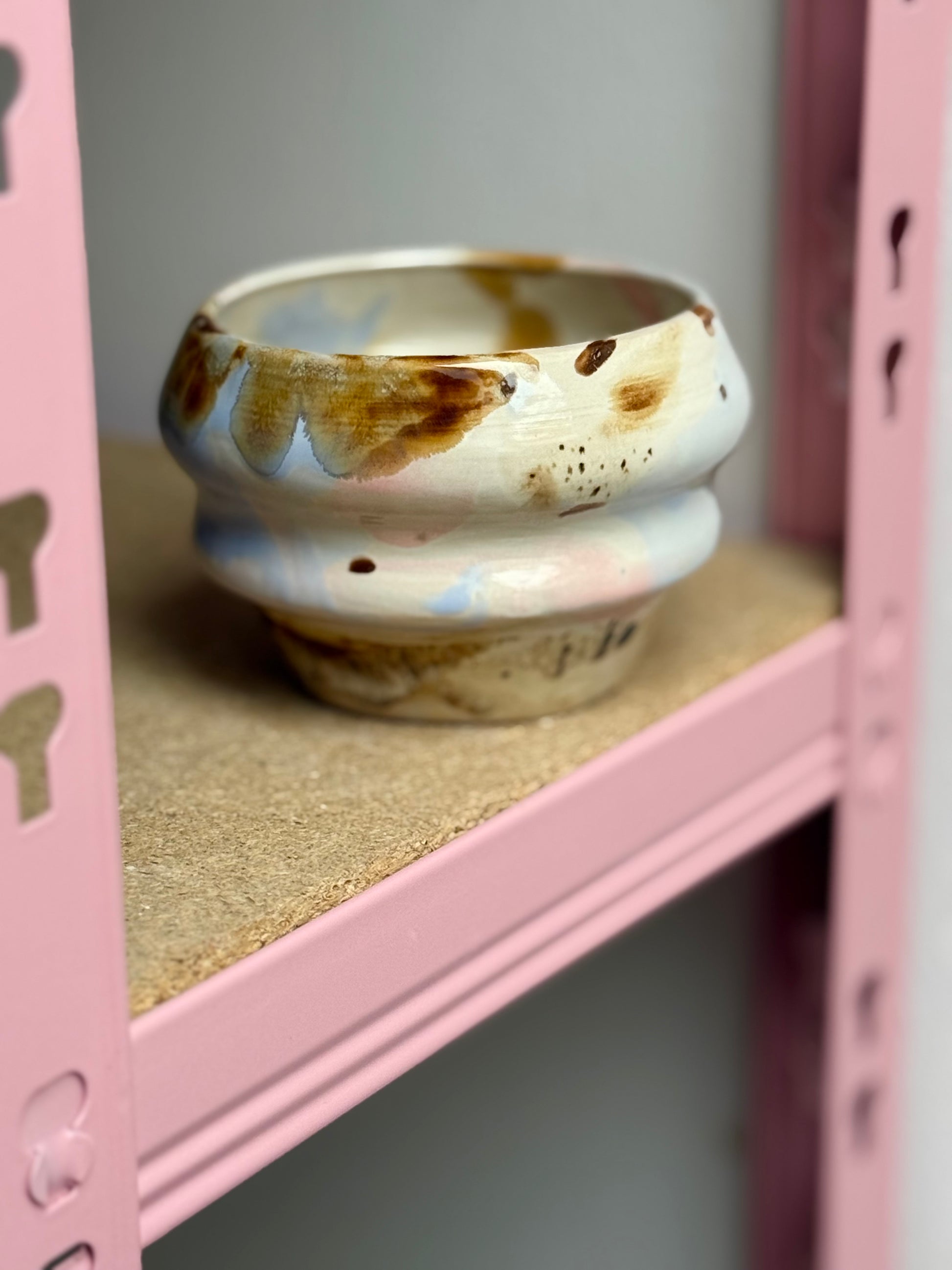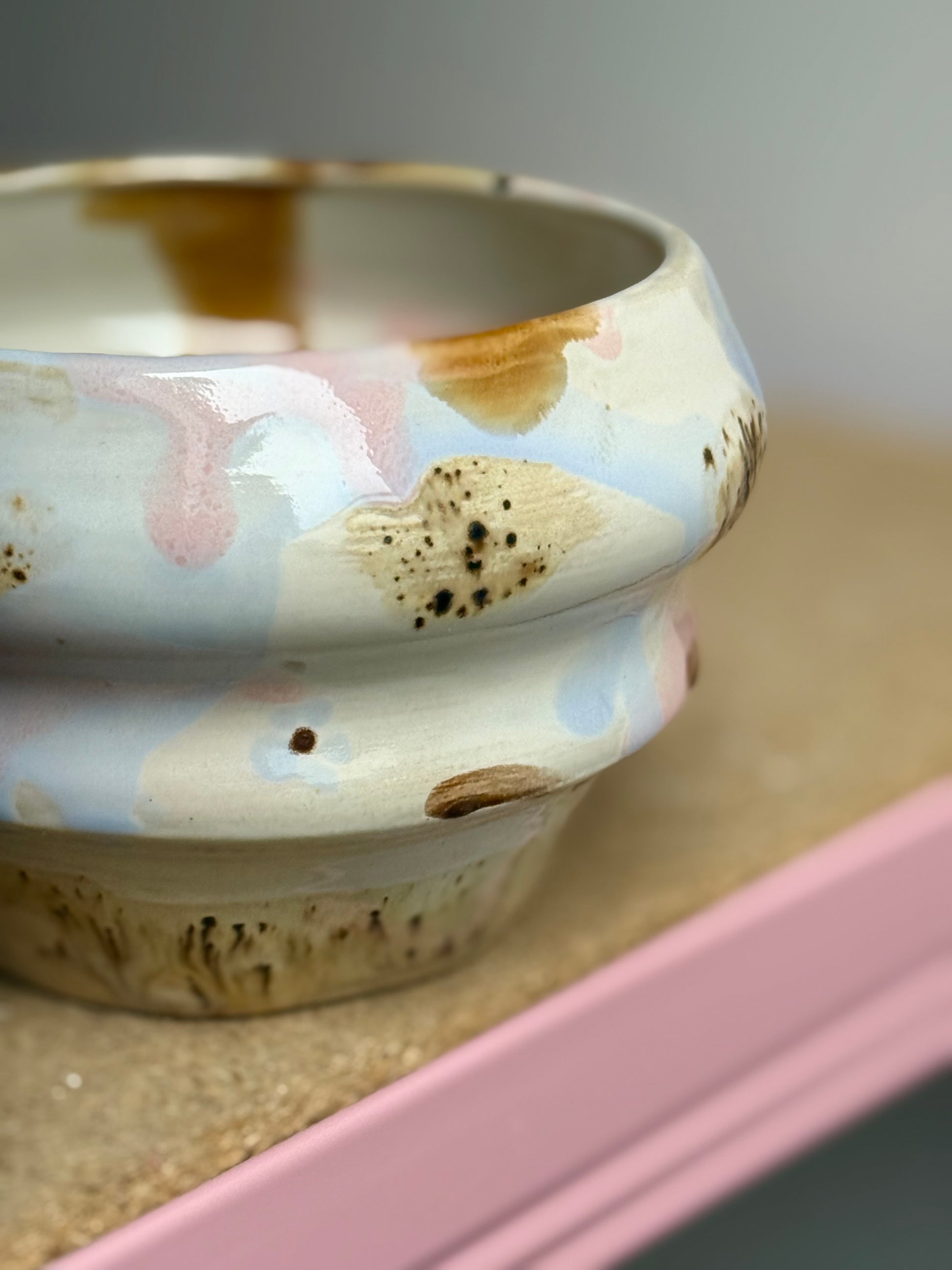 Ceramiczny kubek, toczony na kole garncarskim z pięknymi brzuszkami, dzięki którym bardzo przyjemnie układa się w dłoni. Kubek posiada różnokolorowe szkliwa, które tworzą piękną kompozycję, kolory nawzajem się przenikają tworząc harmoniczną całość ❤️