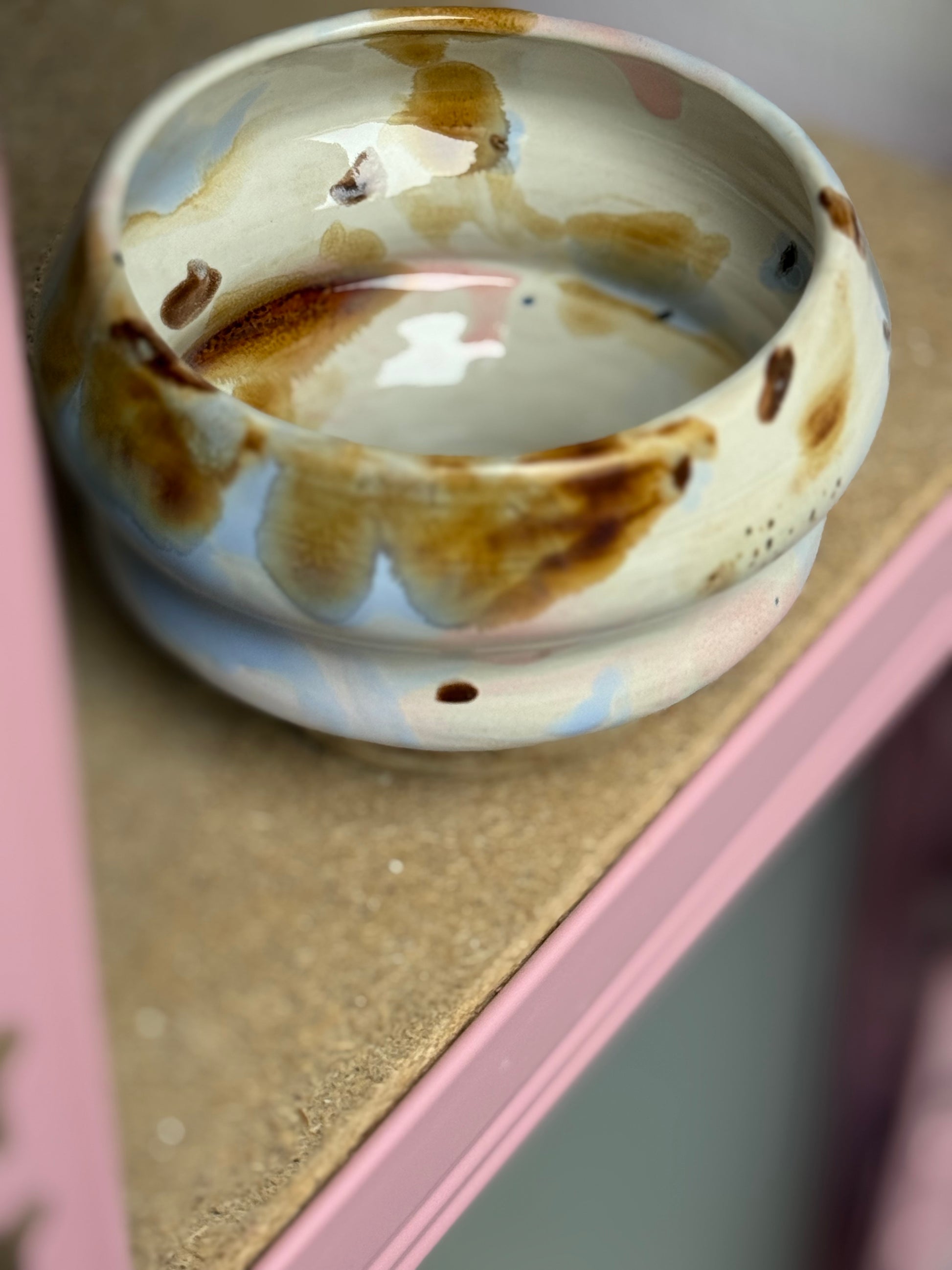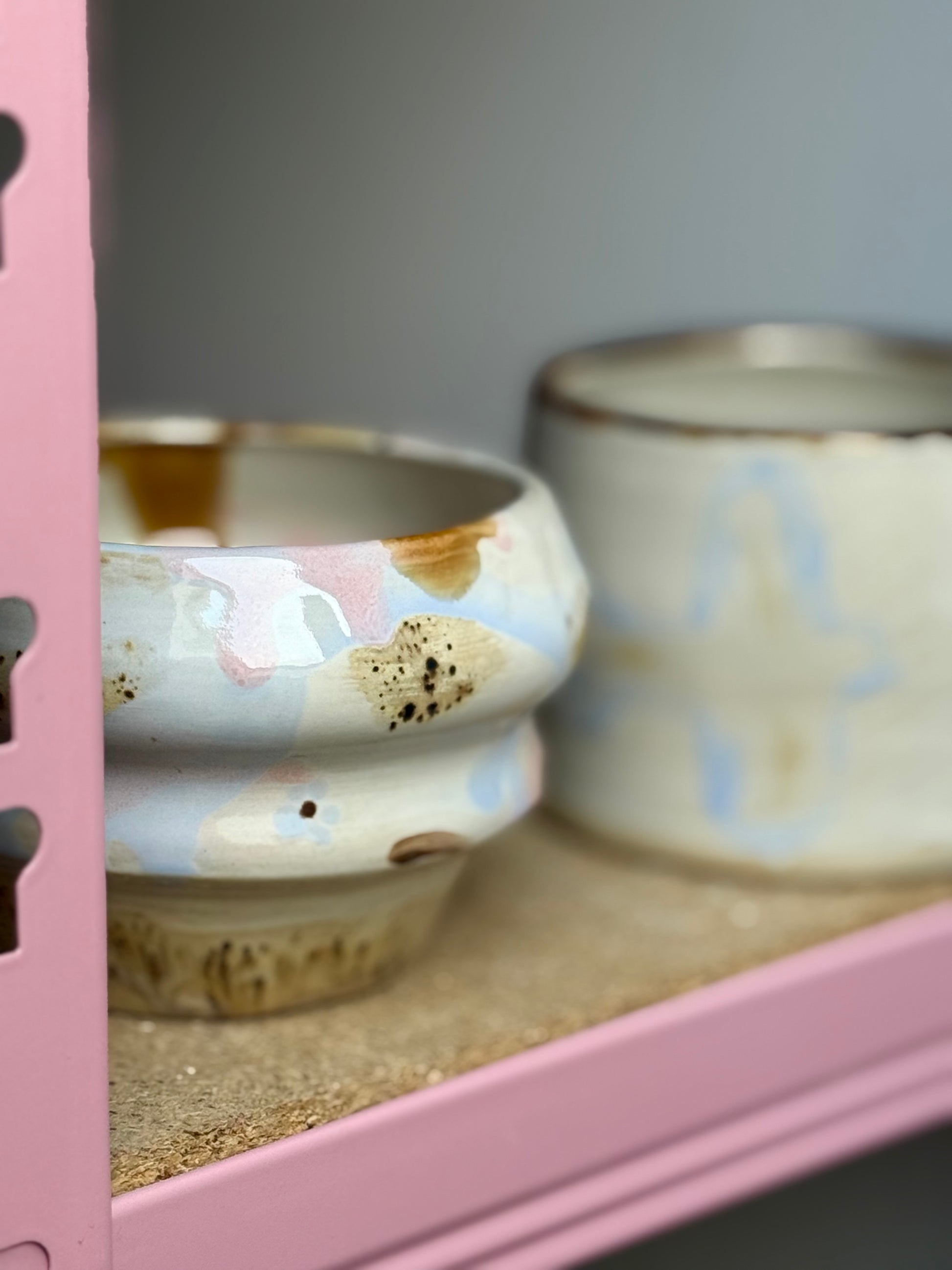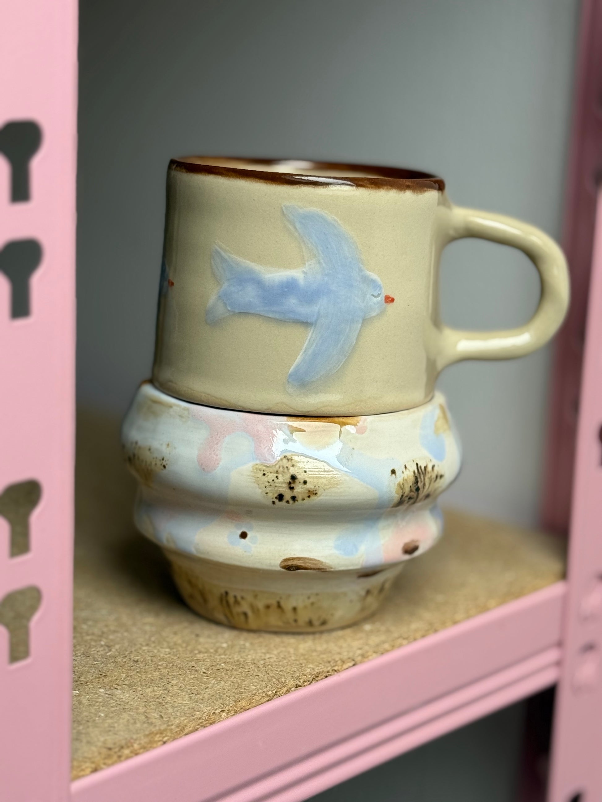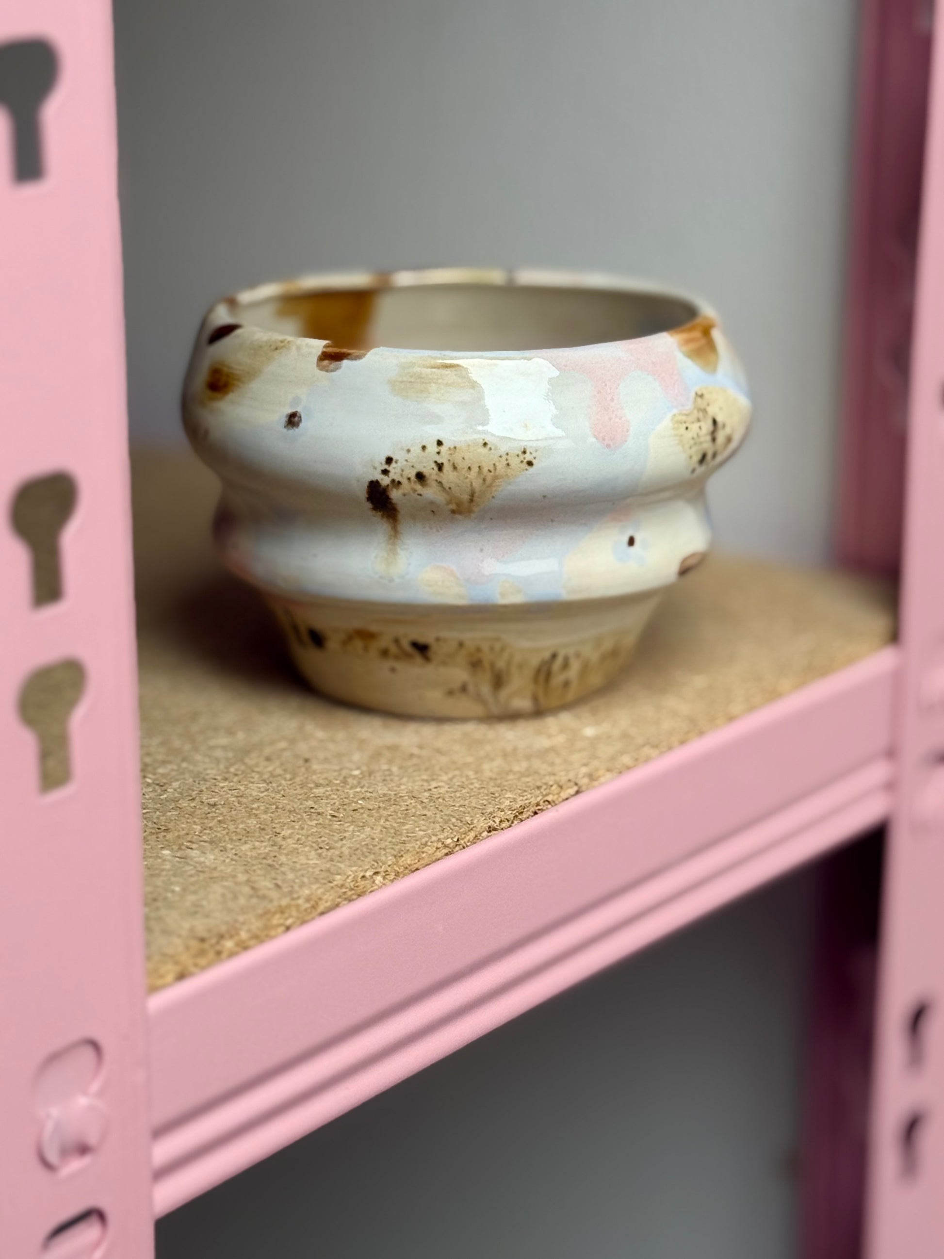 Ceramiczny kubek, toczony na kole garncarskim z pięknymi brzuszkami, dzięki którym bardzo przyjemnie układa się w dłoni. Kubek posiada różnokolorowe szkliwa, które tworzą piękną kompozycję, kolory nawzajem się przenikają tworząc harmoniczną całość ❤️