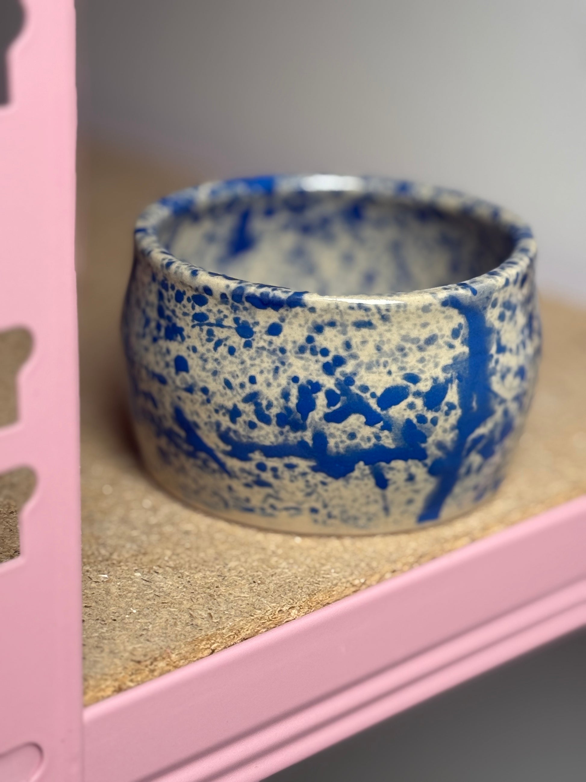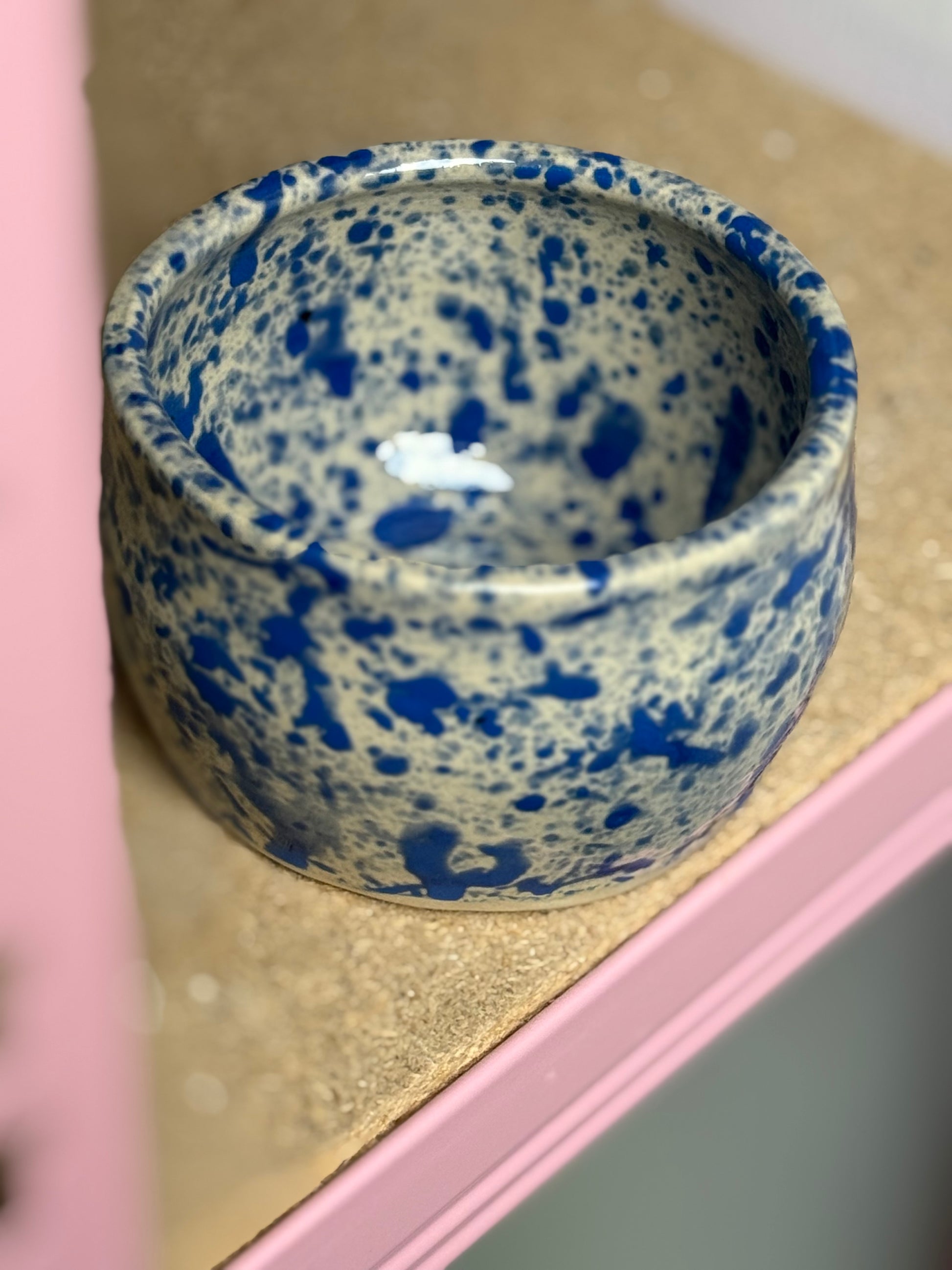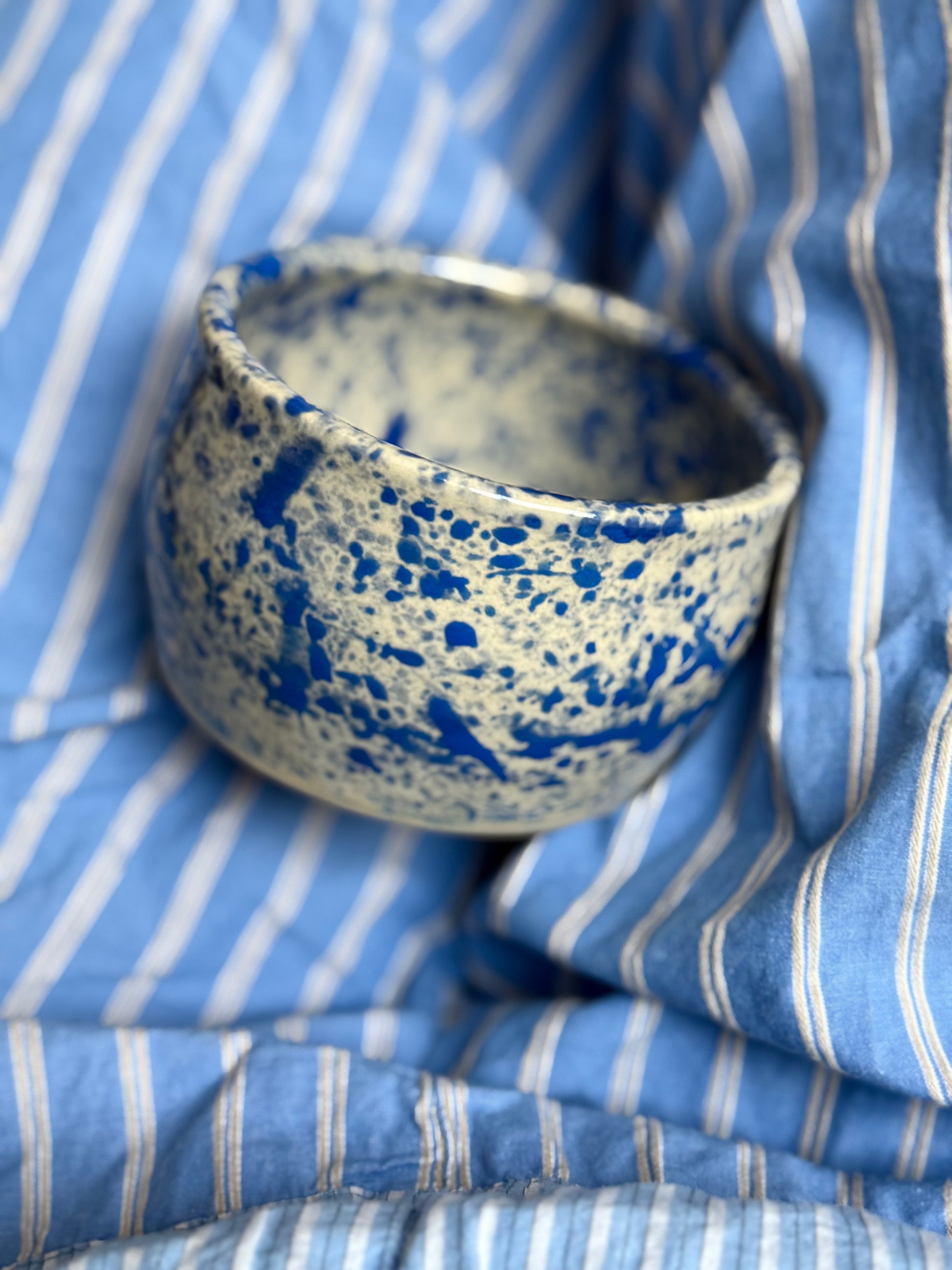 Kubek ceramiczny, toczony na kole garncarskim. Kubek posiada dużo granatowych ciapek, któretworzą piękny kontrast z naturalnym kolorem gliny. Idealny do naparów czy porannej kawy, będzie pięknie komponował się na półce w kuchni dodając jej charakteru :)