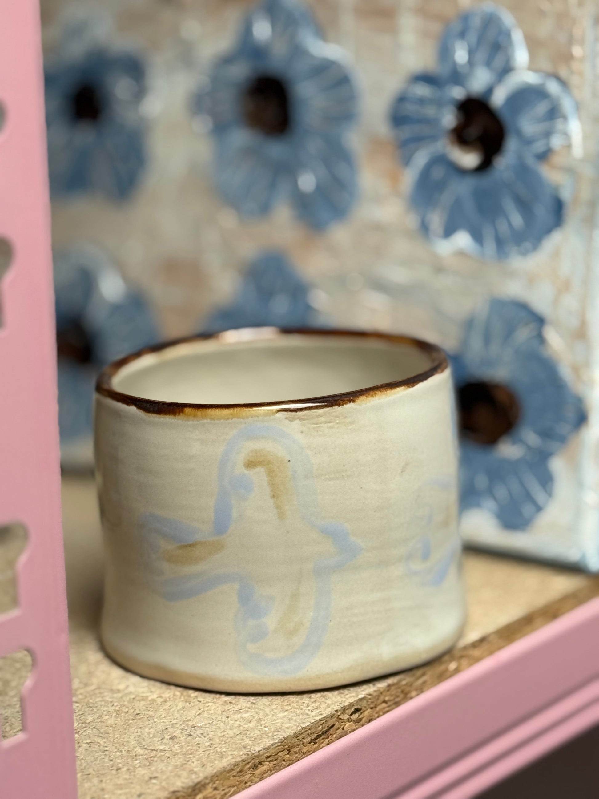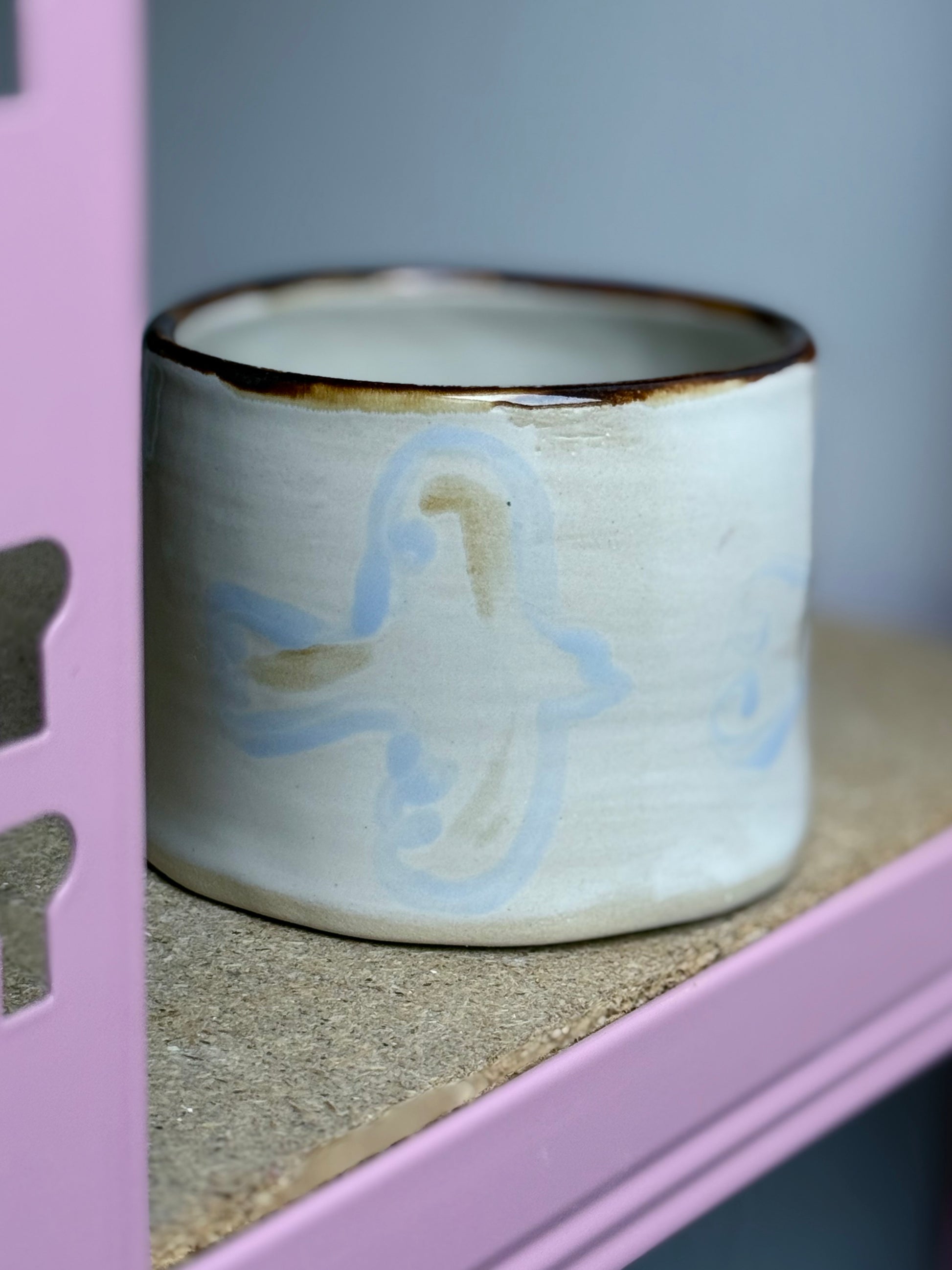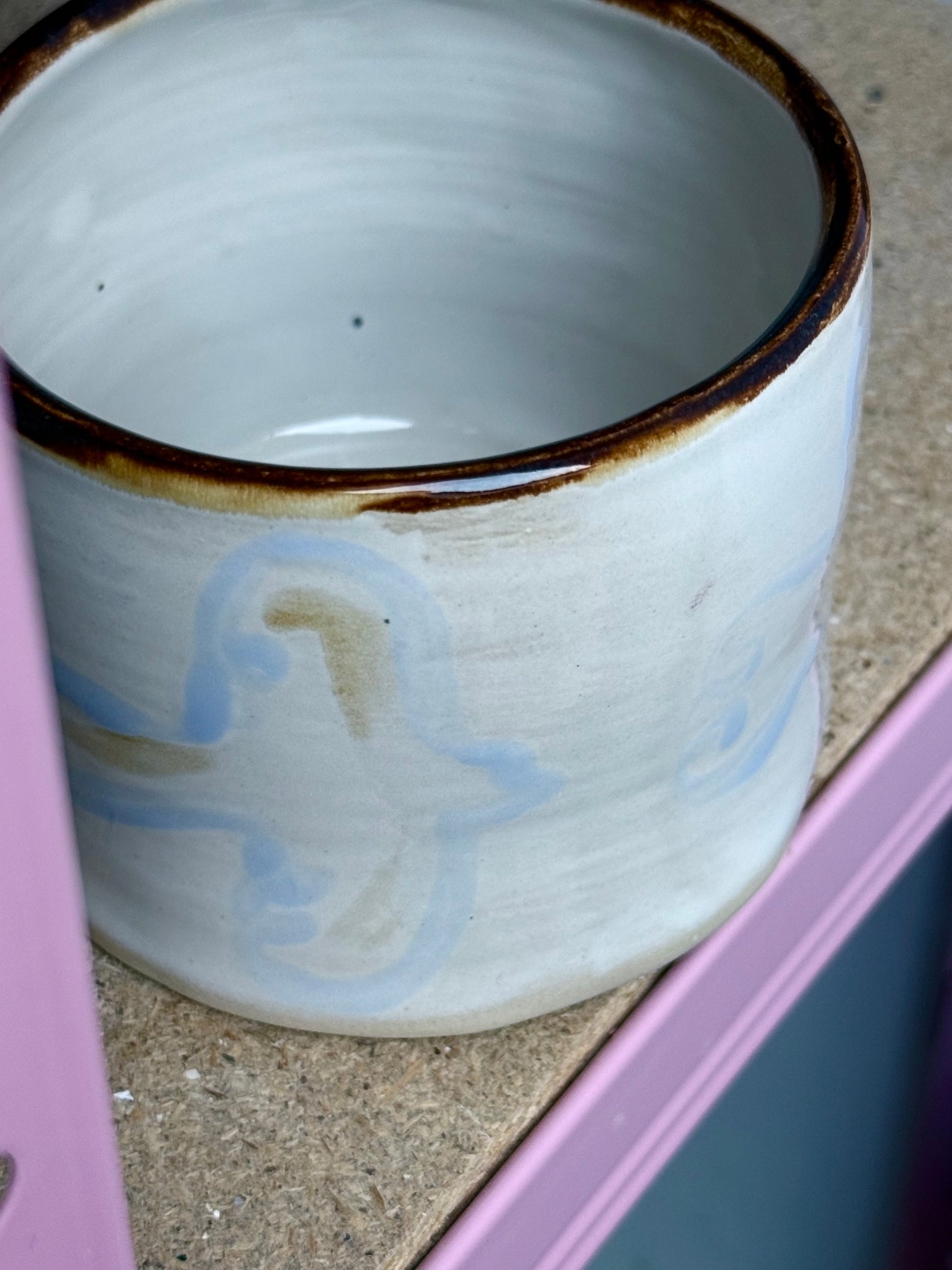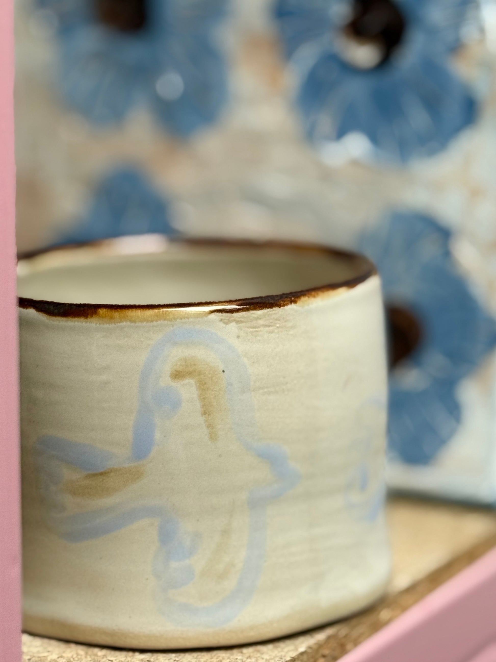 Ręcznie toczony kubek o subtelnym, kremowym szkliwie, ozdobiony delikatnym malunkiem ptaka w jasnobłękitnych i piaskowych tonach. Jego miękka linia i naturalna faktura nadają mu spokojny, kojący charakter, a brązowa krawędź dodaje lekko rustykalnego wykończenia. To kubek, które idealnie wpisze się w codzienne rytuały