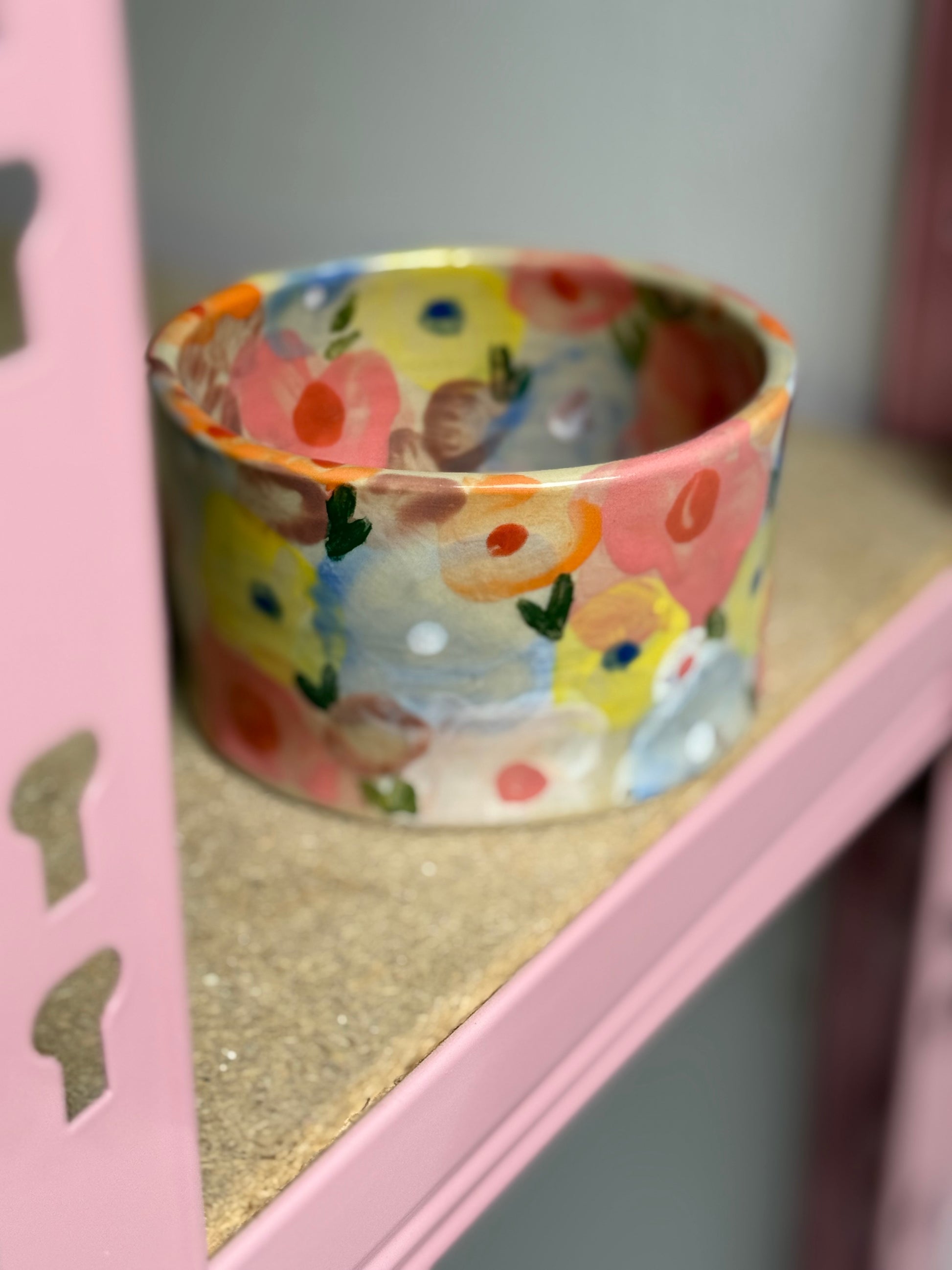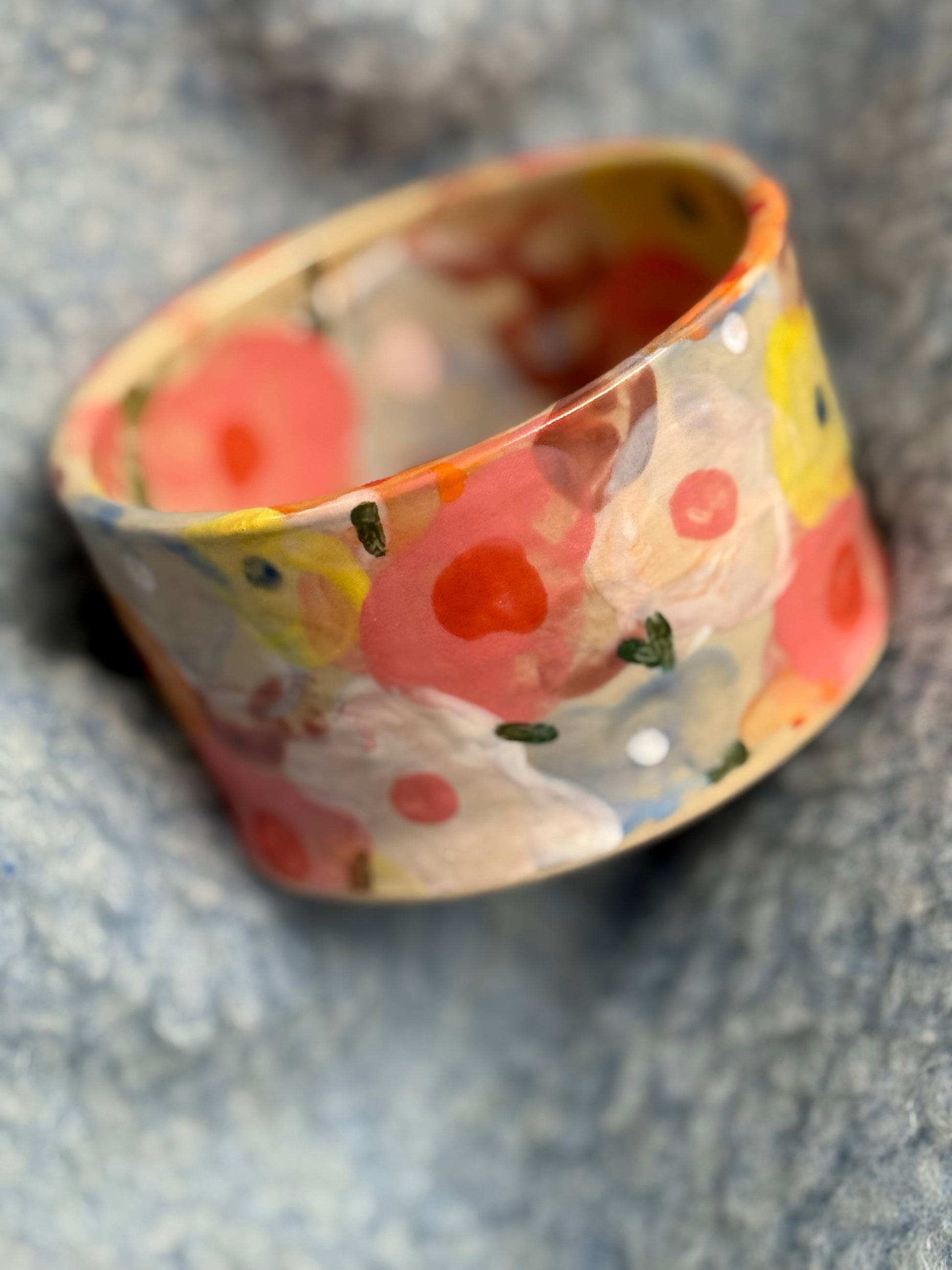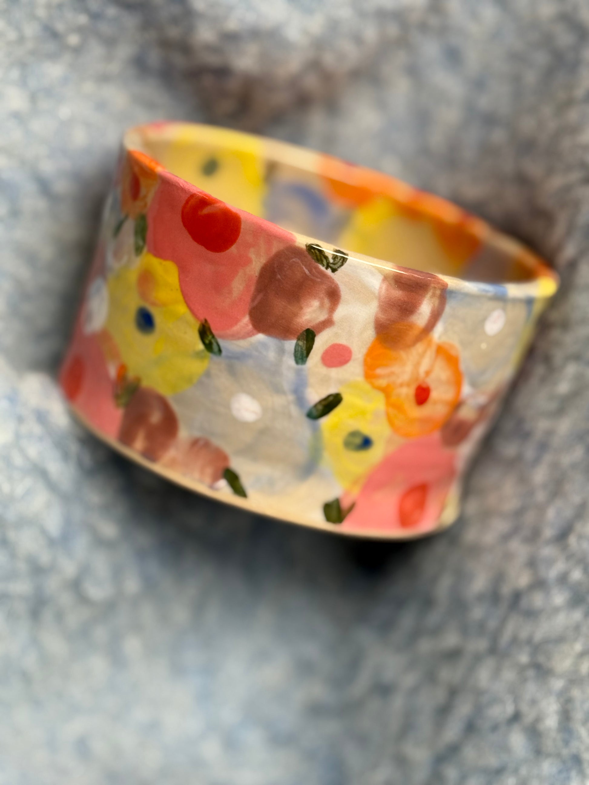 Kubek ceramiczny, toczony na kole garncarskim i ręcznie malowany. Jego powierzchnię pokrywają barwne kwiaty. Nie ma dwóch takich samych kubków – każdy ruch pędzla tworzy własną, niepowtarzalną historię. Pięknie odnajdzie się w każdym wnętrzu wprowadzając delikatny, sielski klimat