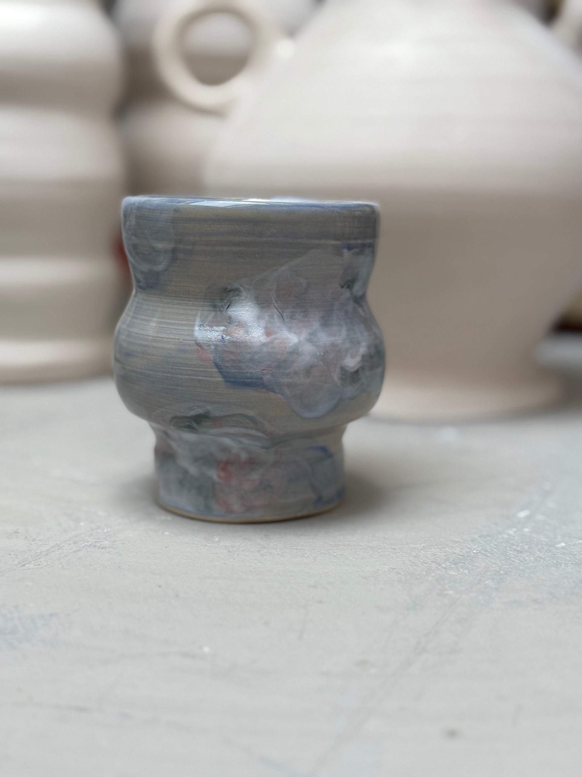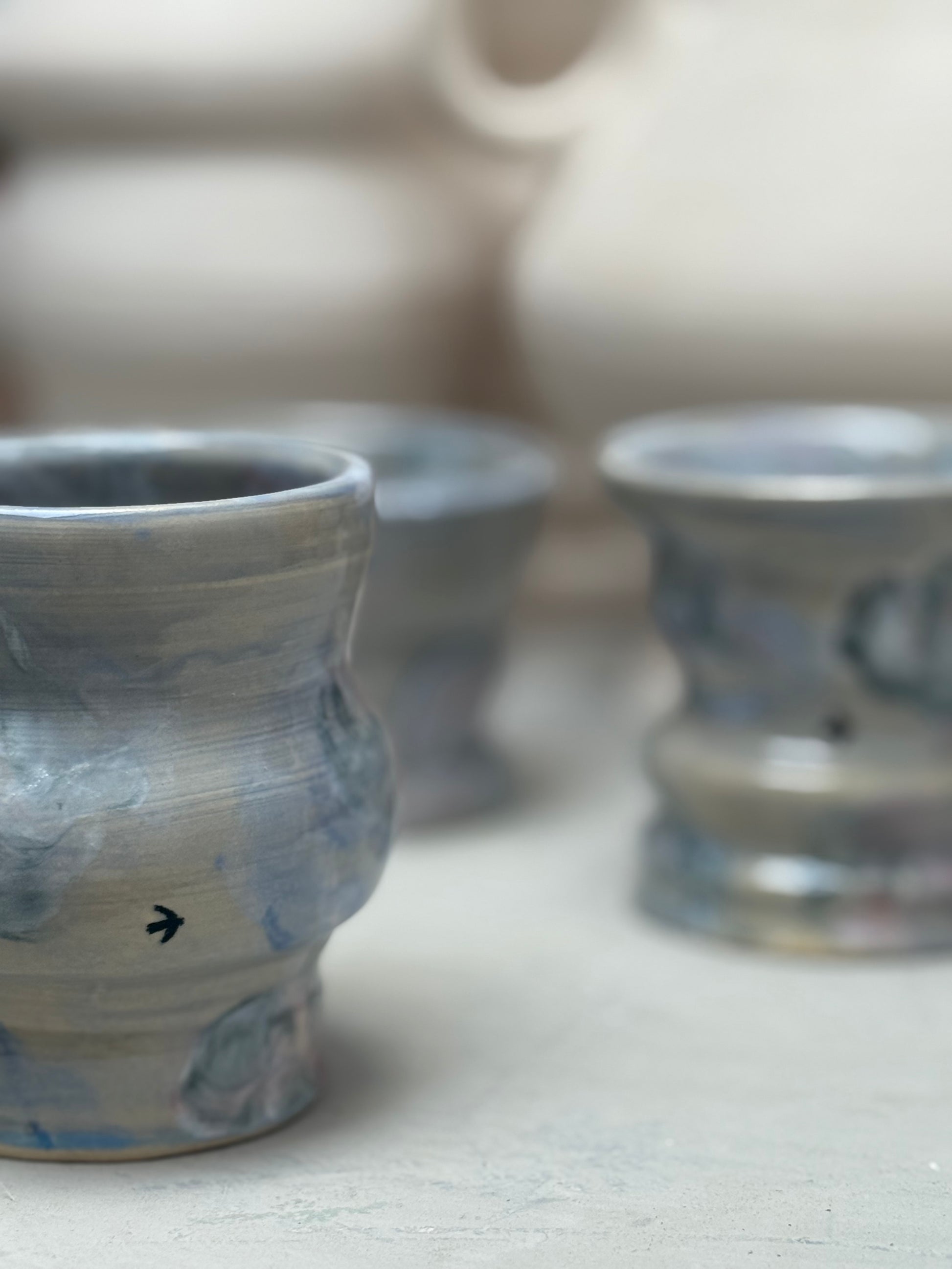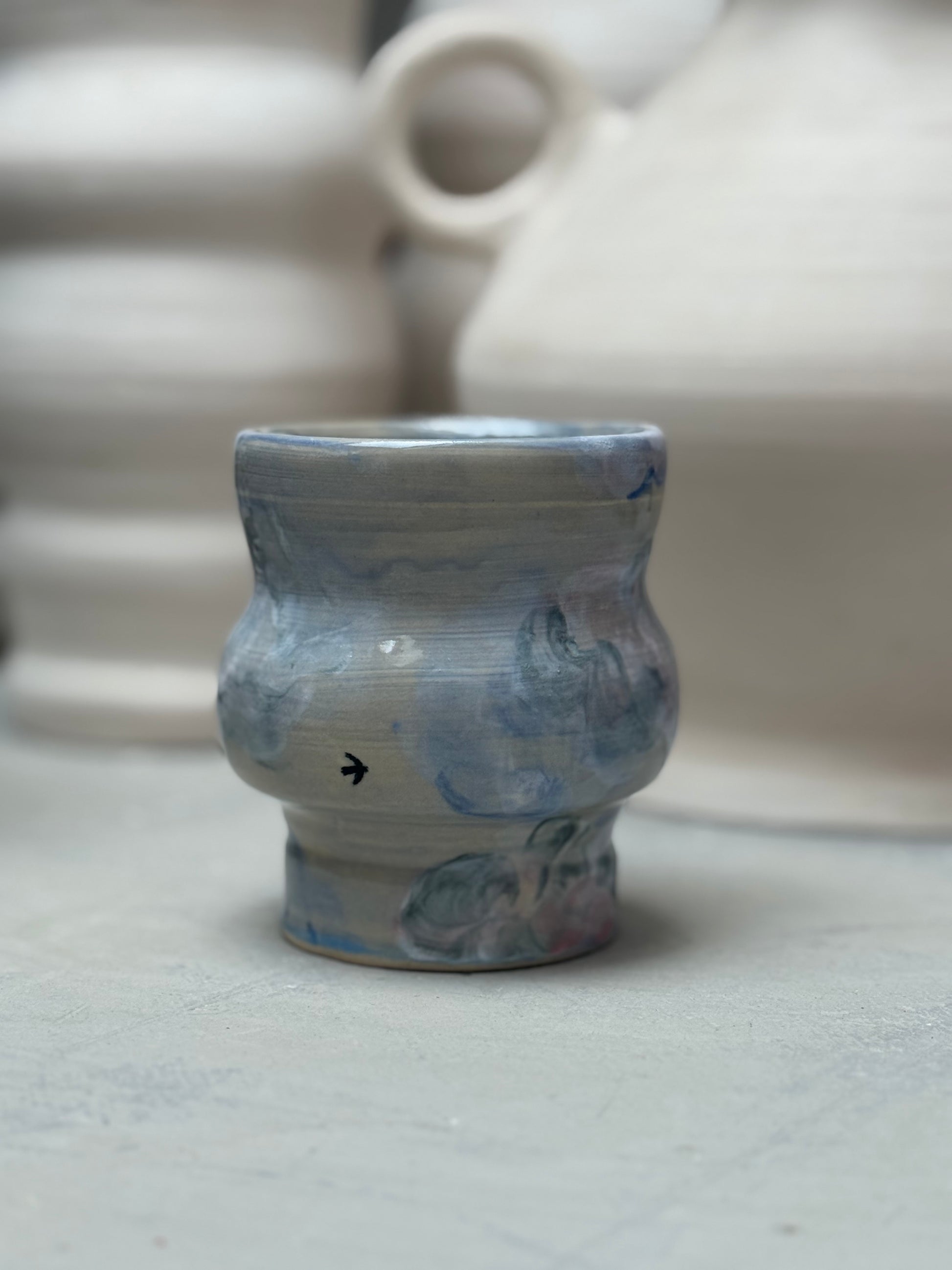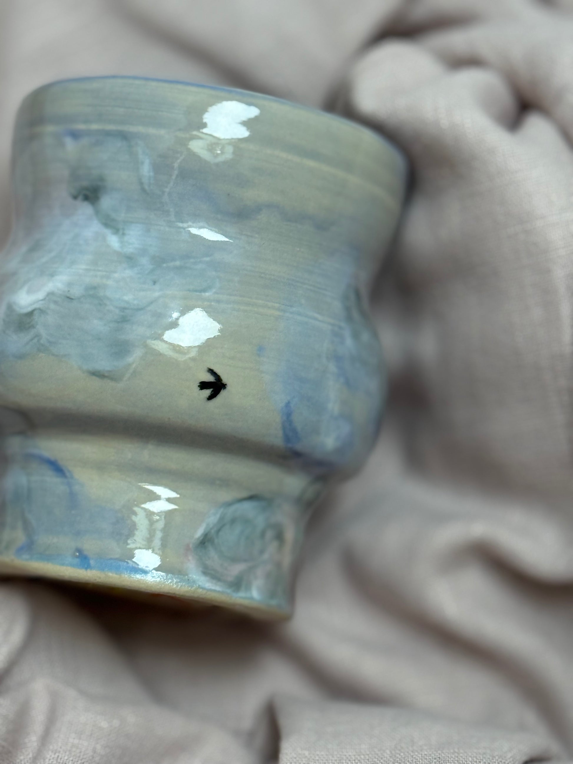 Kubek ceramiczny, toczony na kole garncarskim i ręcznie malowany, przedstawia spokojne niebo pełne miękkich chmur w odcieniach różu, błękitu i szarości. Każdy ruch pędzla jest wyjątkowy, dlatego nie ma dwóch takich samych kubków.