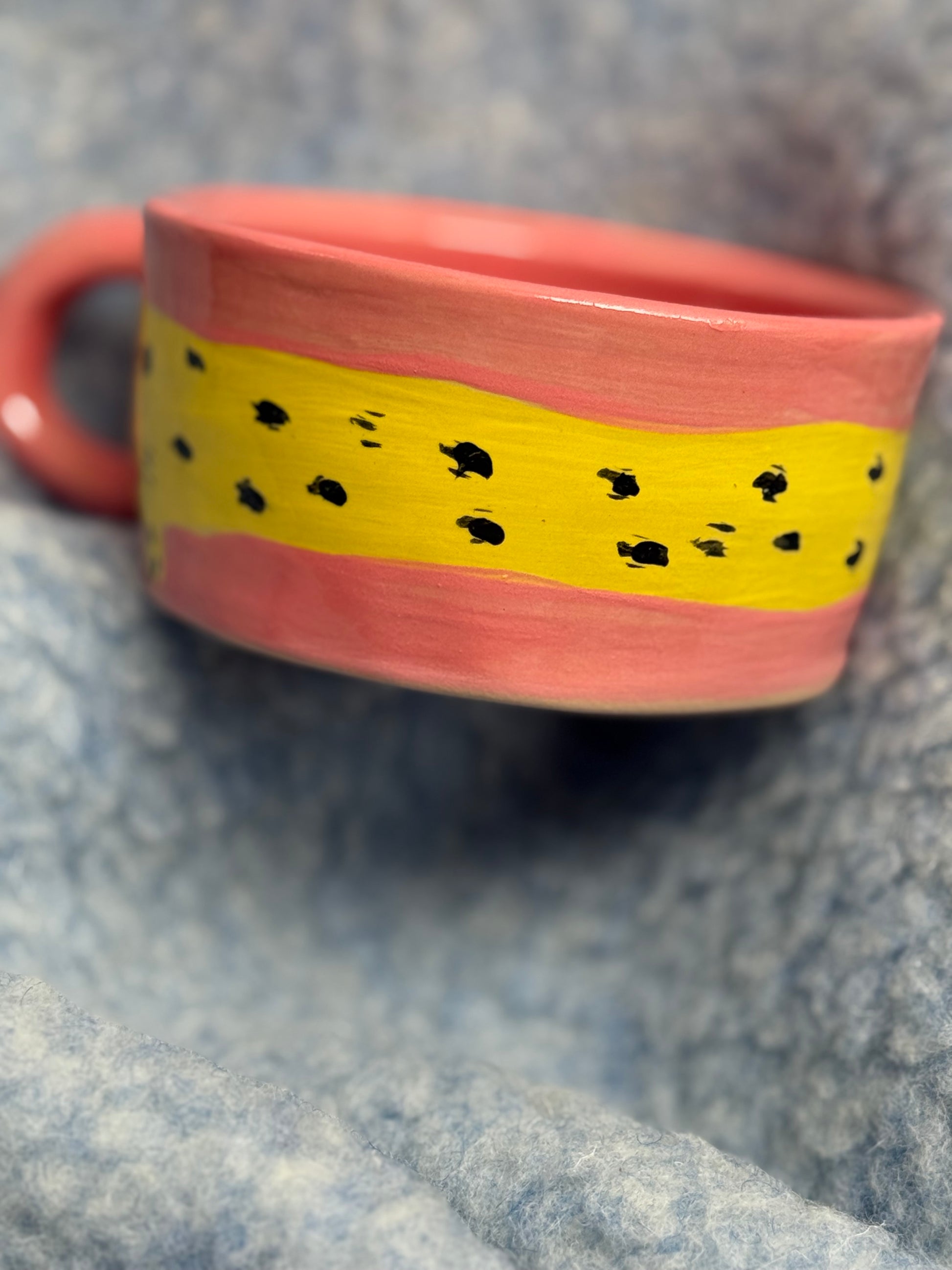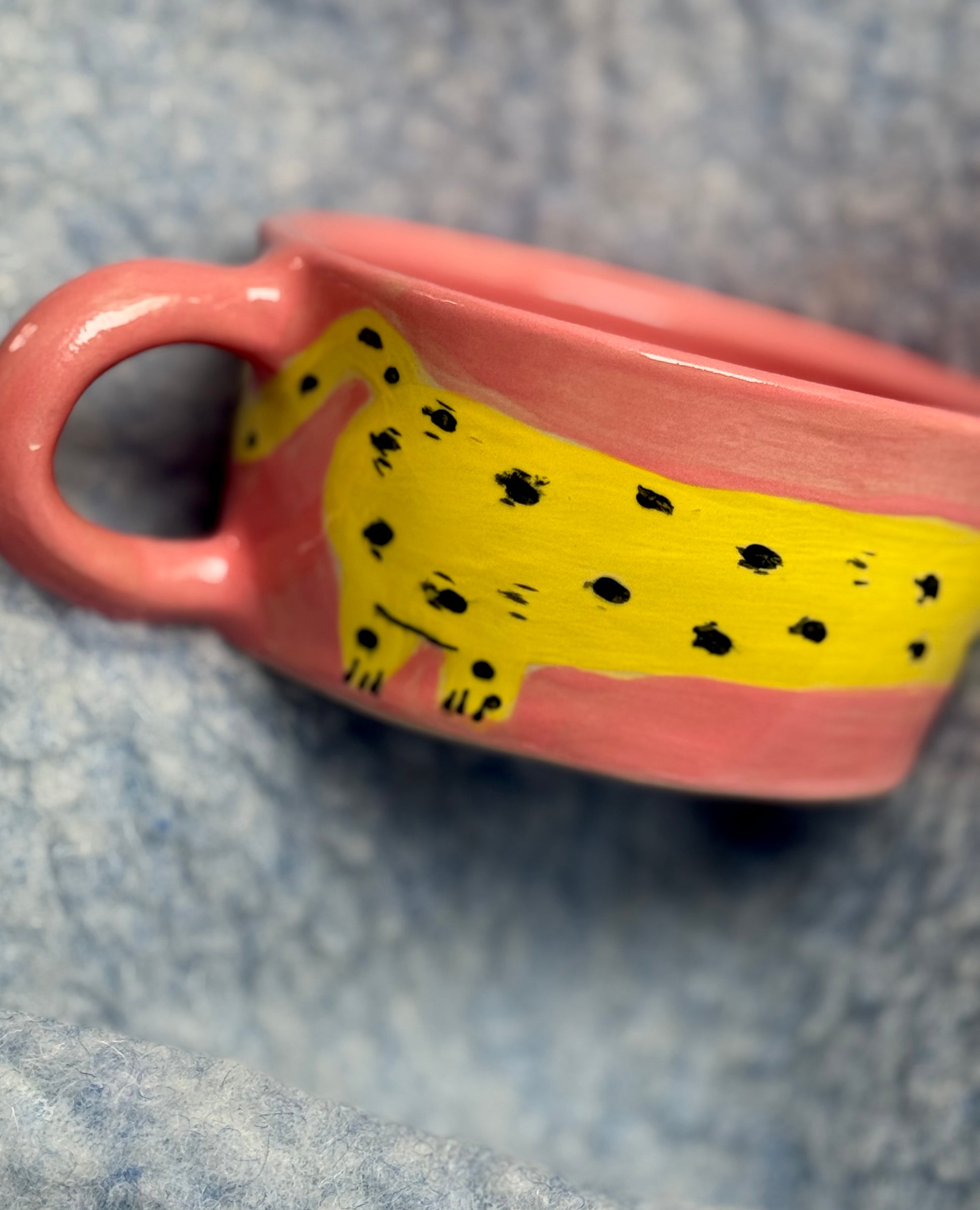 Kubek ceramiczny, toczony na kole garncarskim i ręcznie malowany. Motyw uroczej pantery na różowym tle, będzie rozweselał każdy dzień i dodawał pozytywnej energii :) Kubek pięknie komponuje się z innymi kolorowymi kubkami z kolekcji, tworząc urocze zestawy
