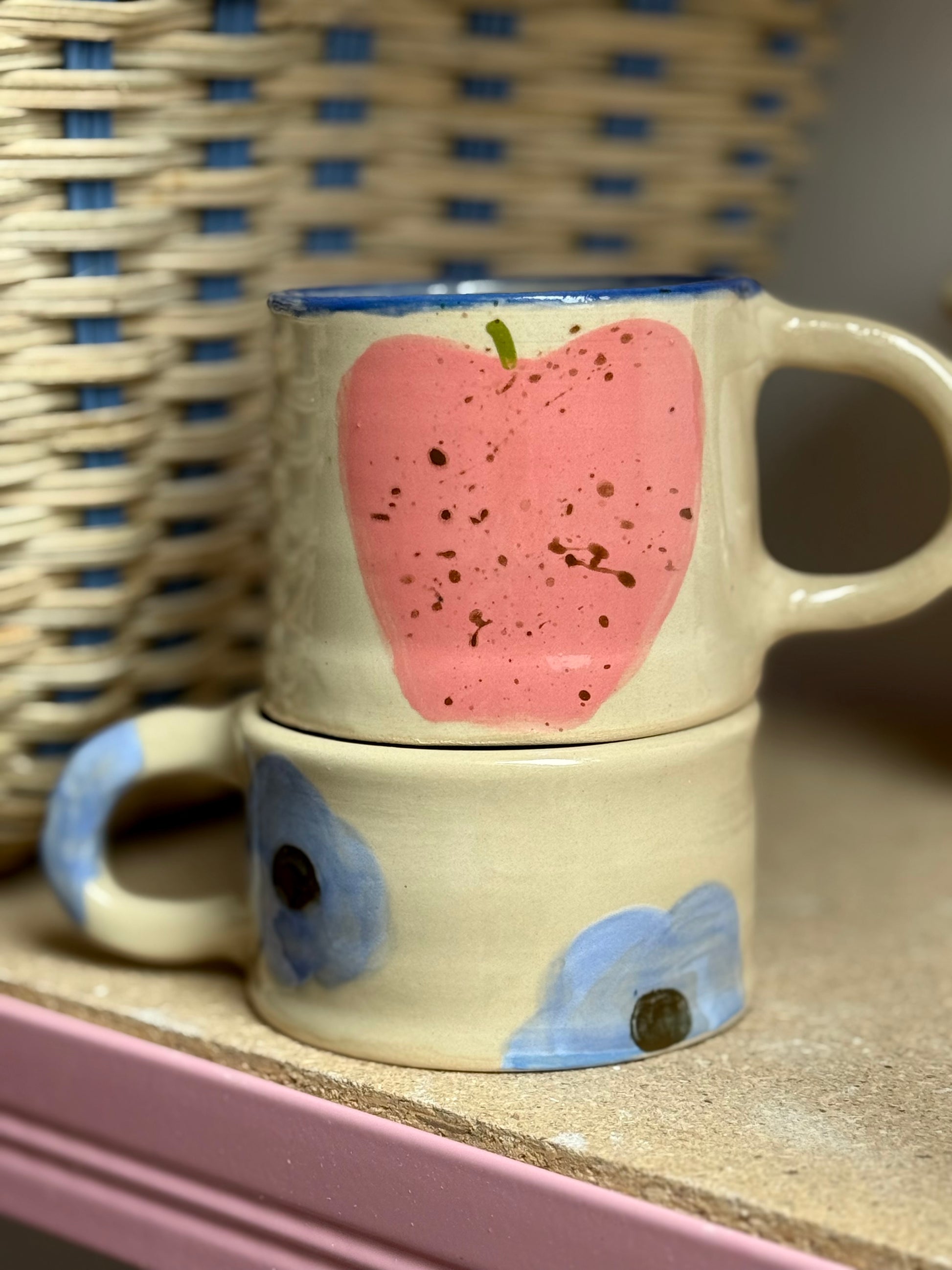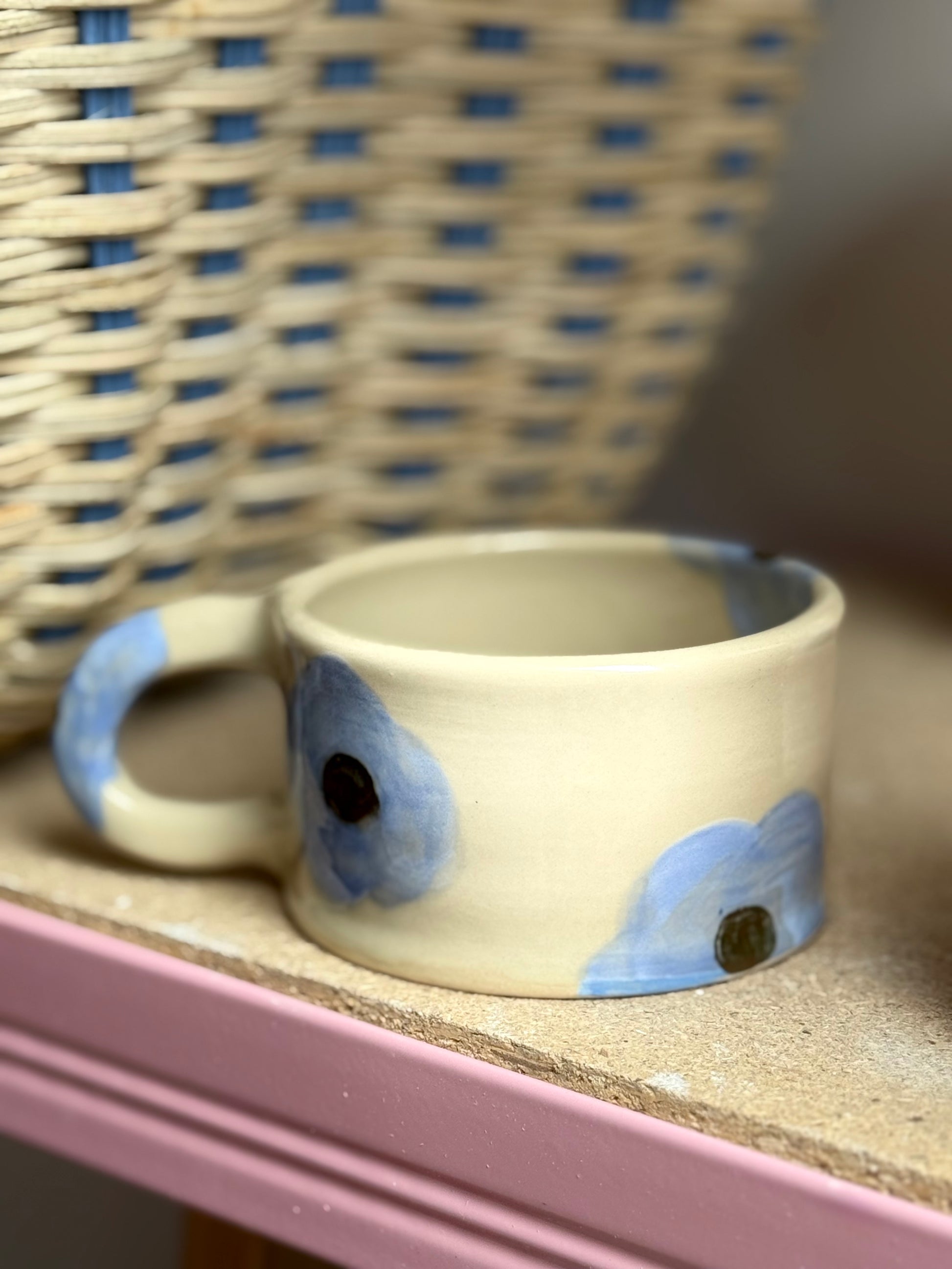 Kubek ceramiczny, toczony na kole garncarskim, ręcznie malowany. Piękne błękitne kwiaty z brązowym środkiem to kolory, które idealnie odnajdują się jesienią w naszych wnętrzach. Kubek stworzony do porannej kawy, wieczornego kakao czy aromatycznej jesiennej herbaty z pomarańczą :)