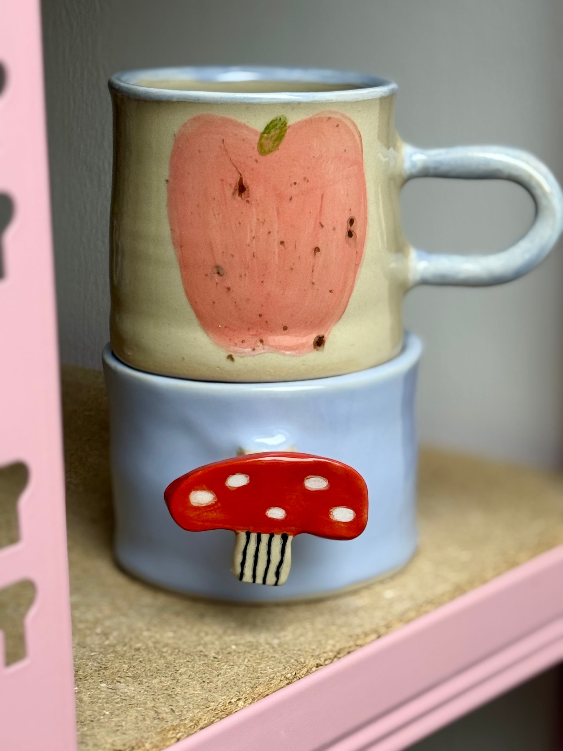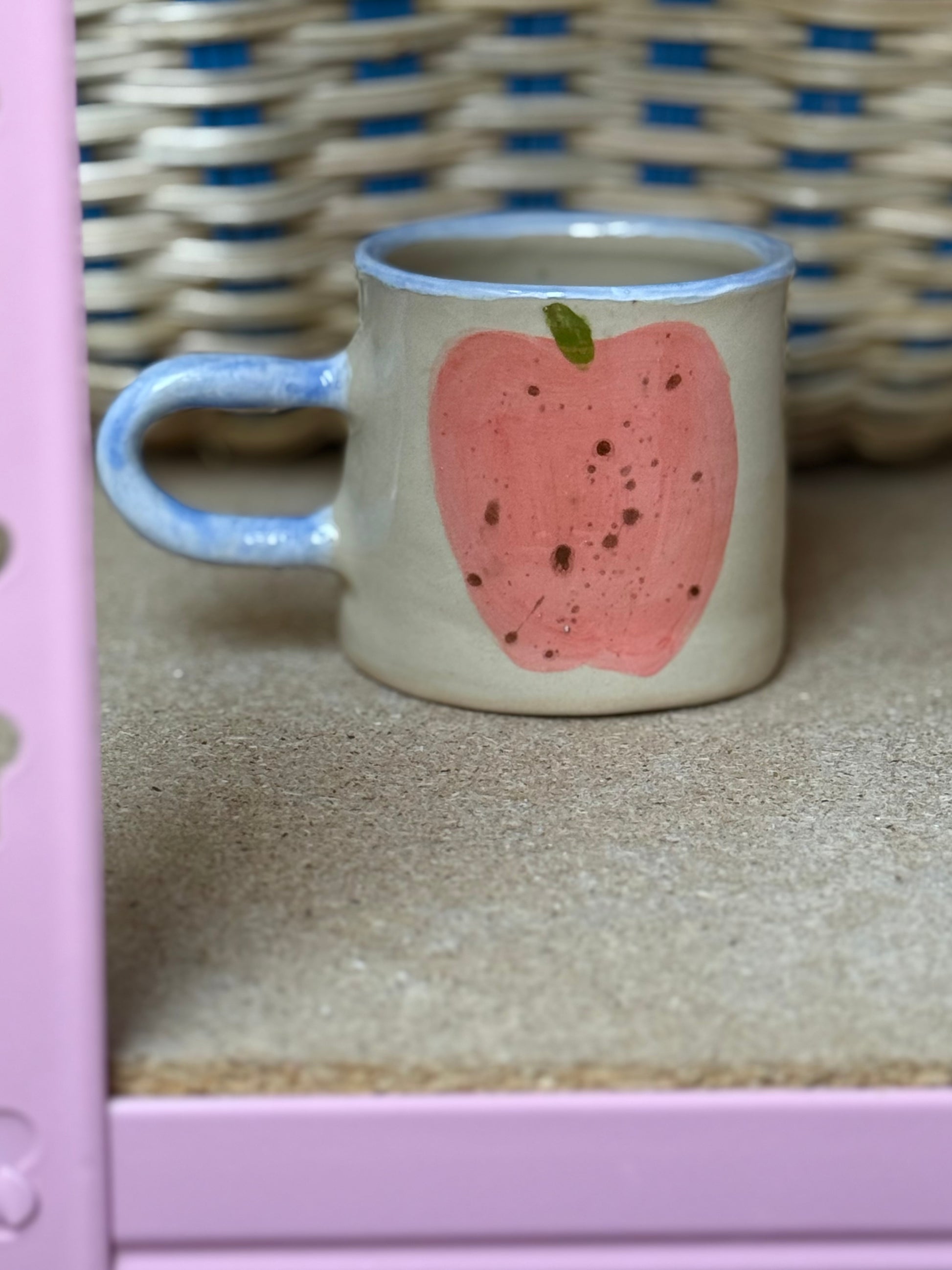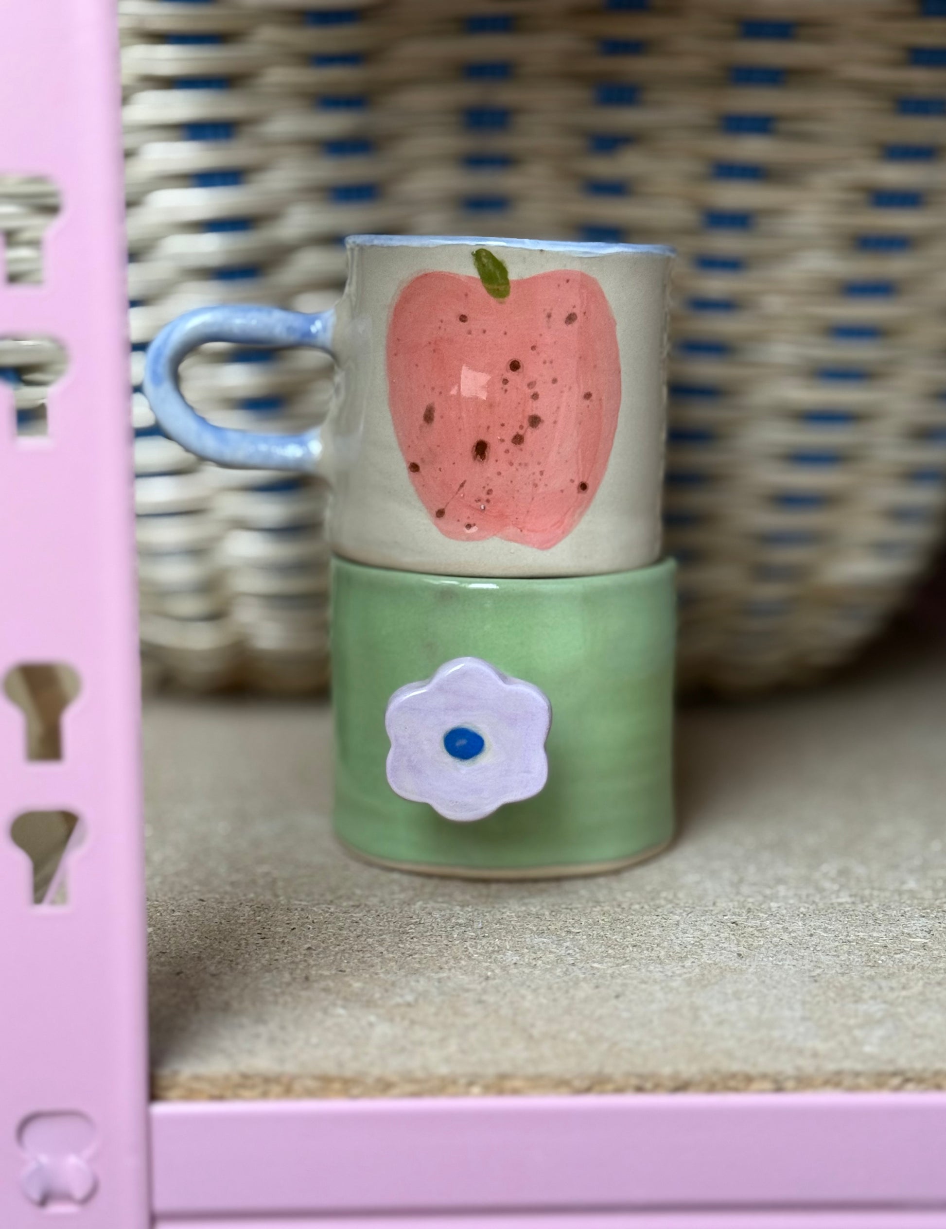 Kubek ceramiczny, toczony na kole garncarskim i ręcznie malowany. Wzór różowego jabłka i błękitny rant przywołują wiejski spokój – jakby pochodził prosto z kuchni w starym domu za sadem :)