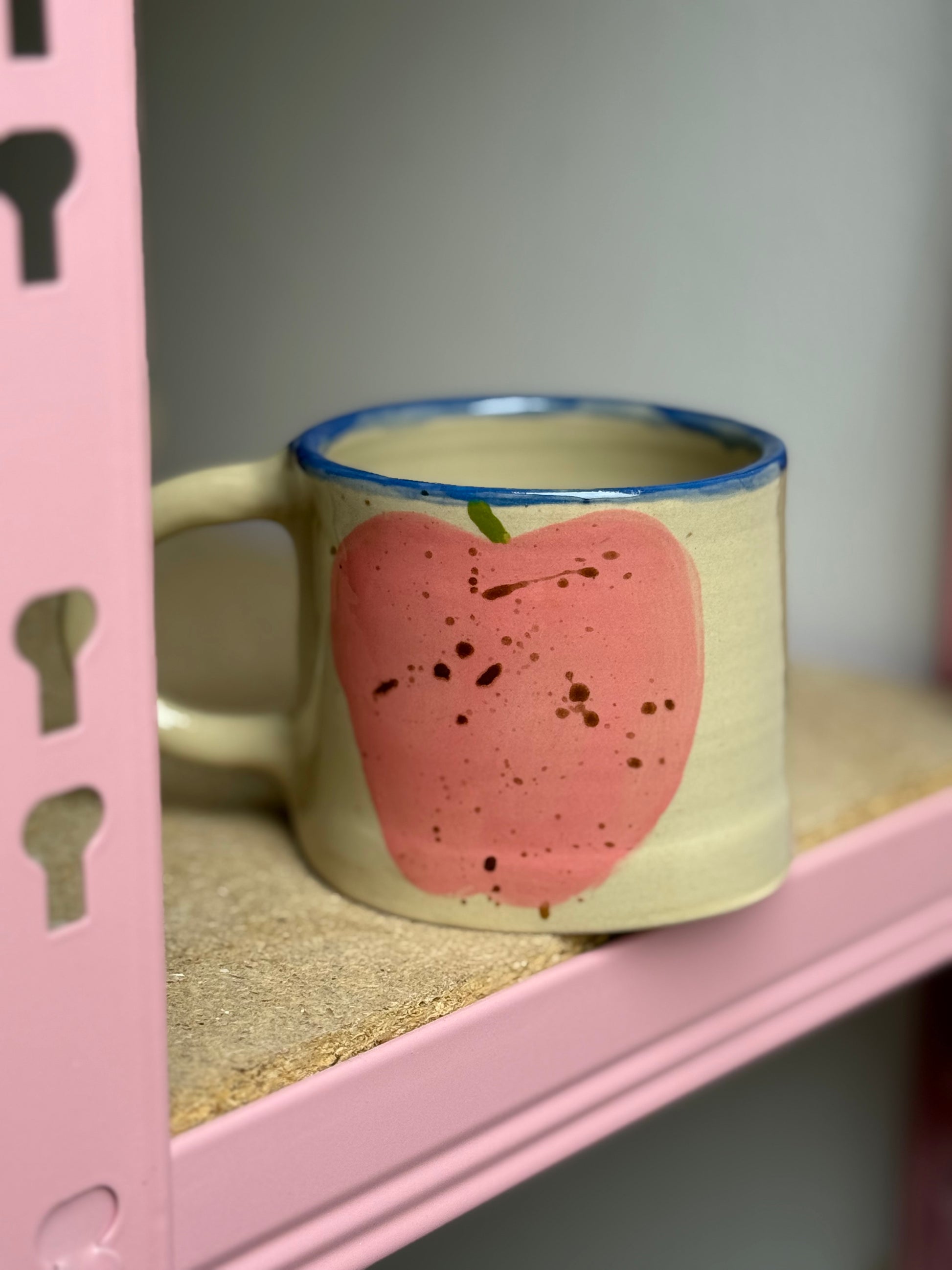 Wzór różowego jabłka i granatowy rant przywołują wiejski spokój – jakby pochodził prosto z kuchni w starym domu za sadem :)