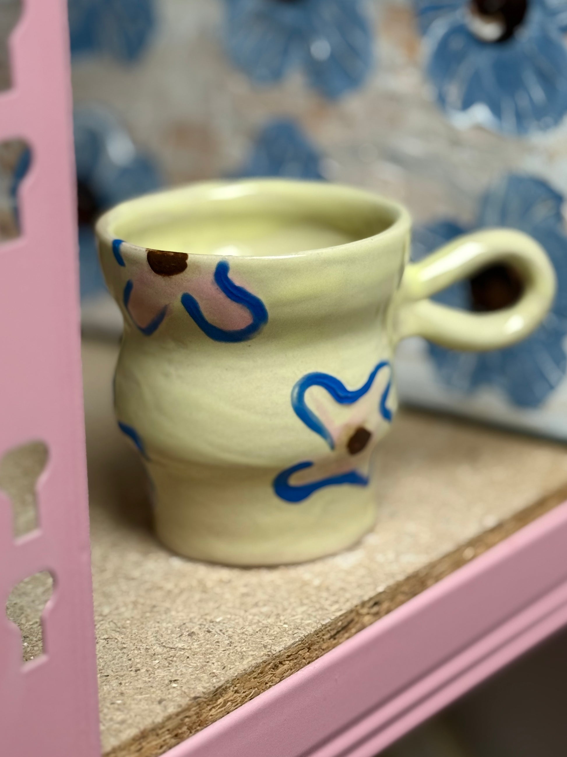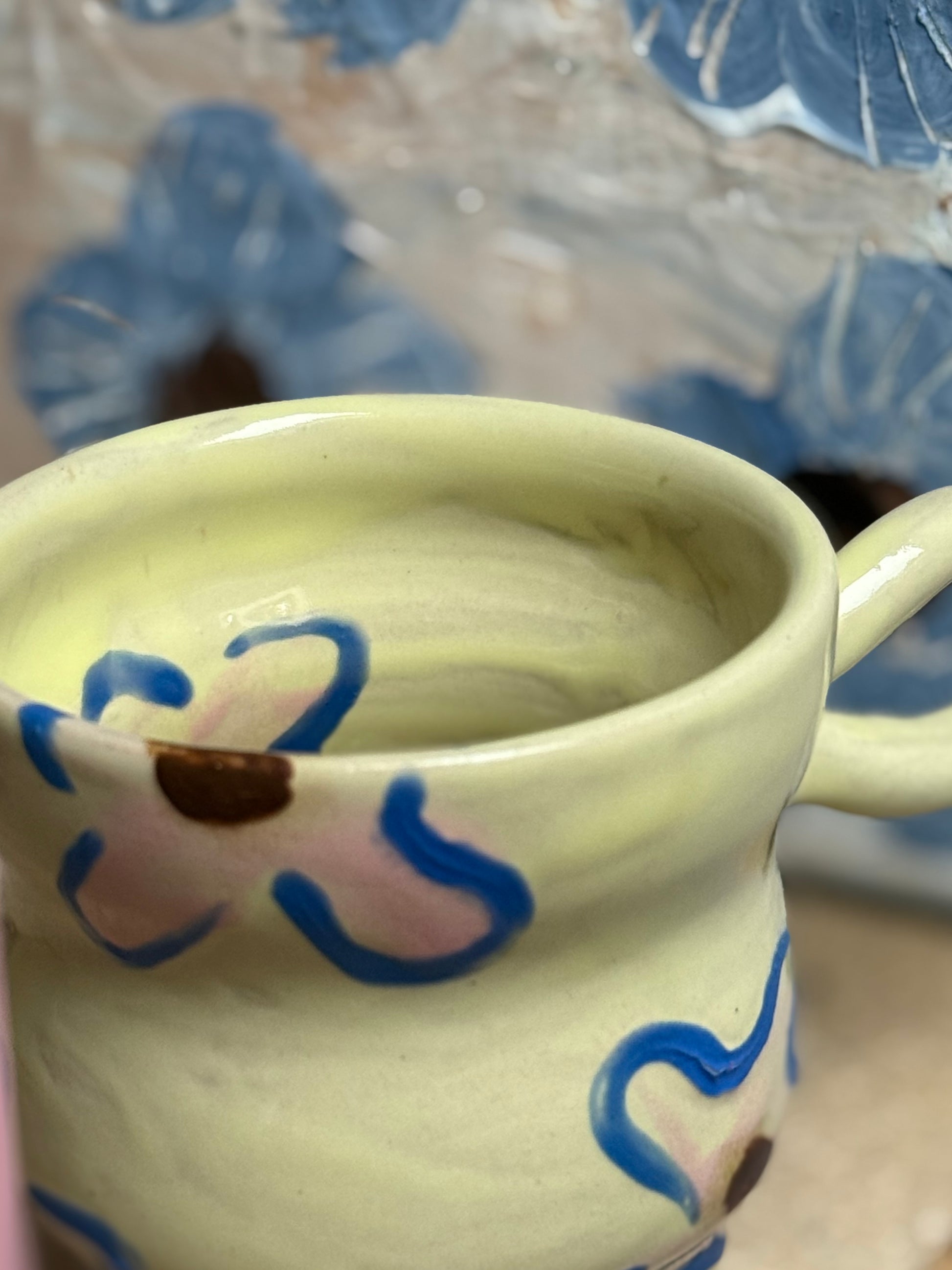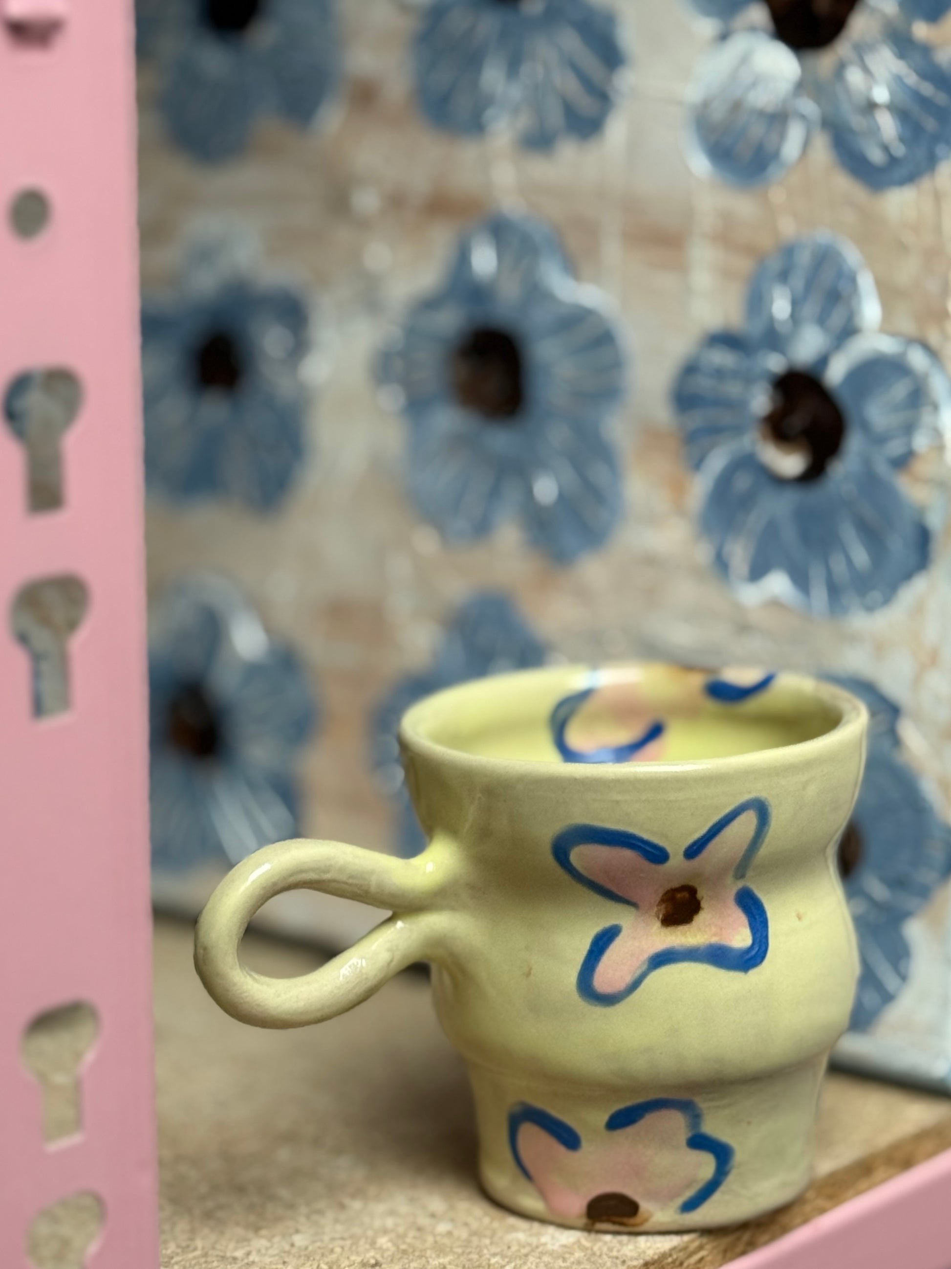 Kubek ceramiczny, toczony na kole garncarskim i ręcznie malowany. W kolorze masełkowym z różowo-granatowymi kwiatkami w środku i na zewnątrz. Kubek posiada oryginalne ucho, które nadaje mu lekkości i ciekawego charakteru.