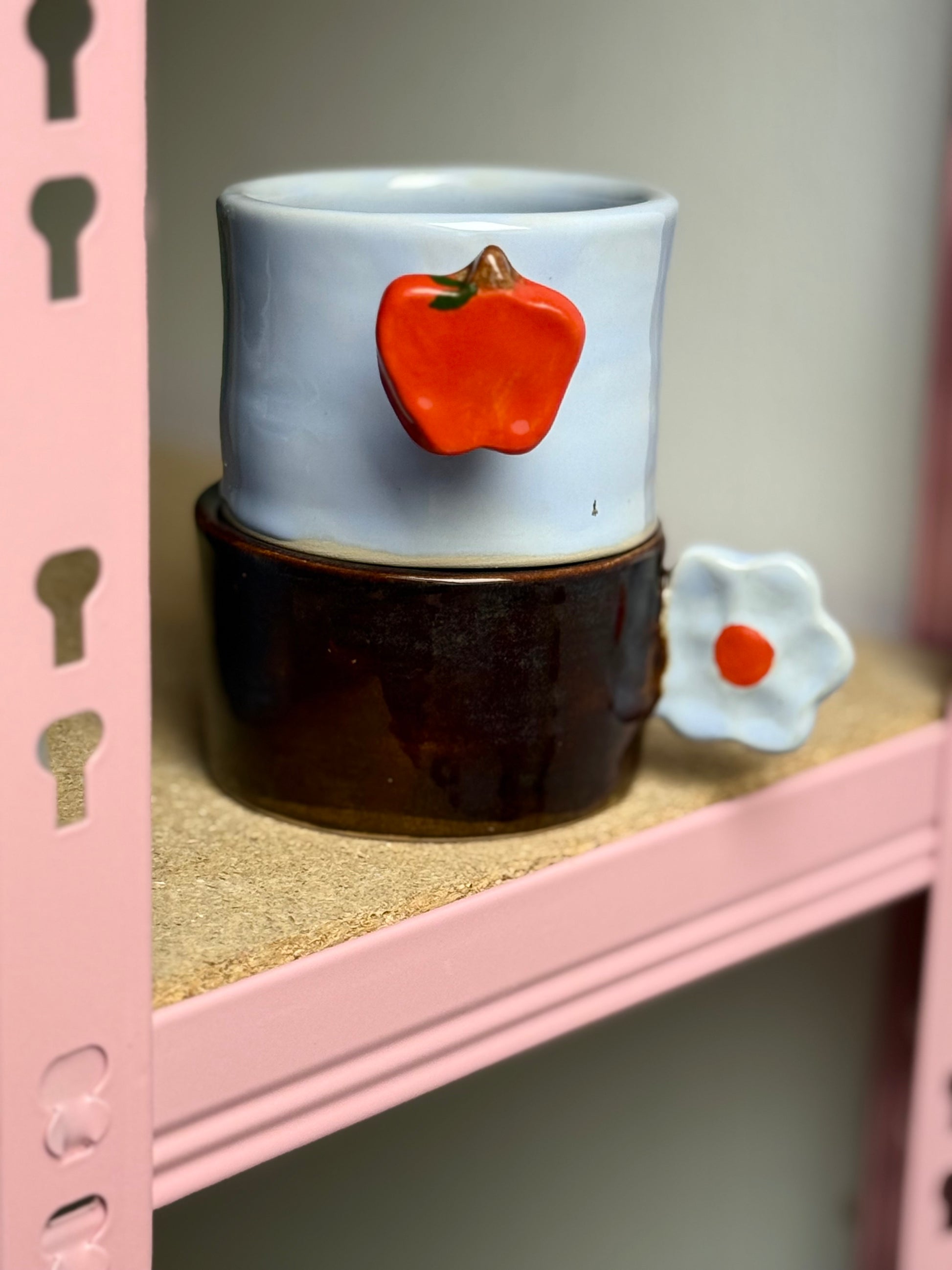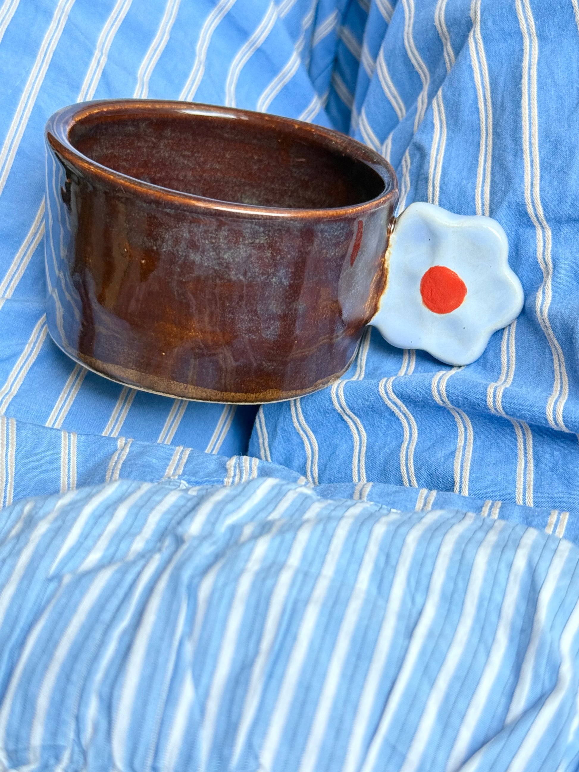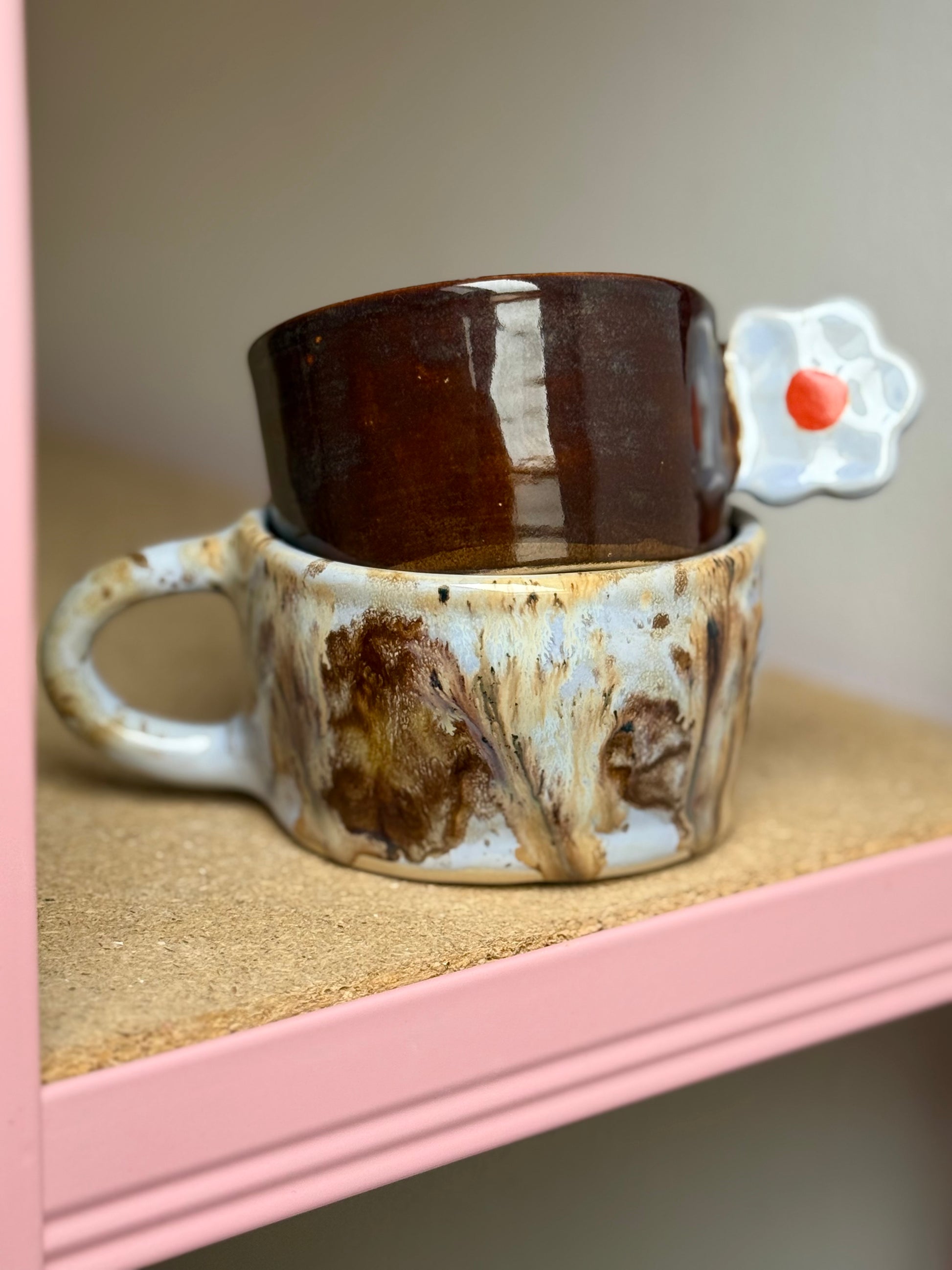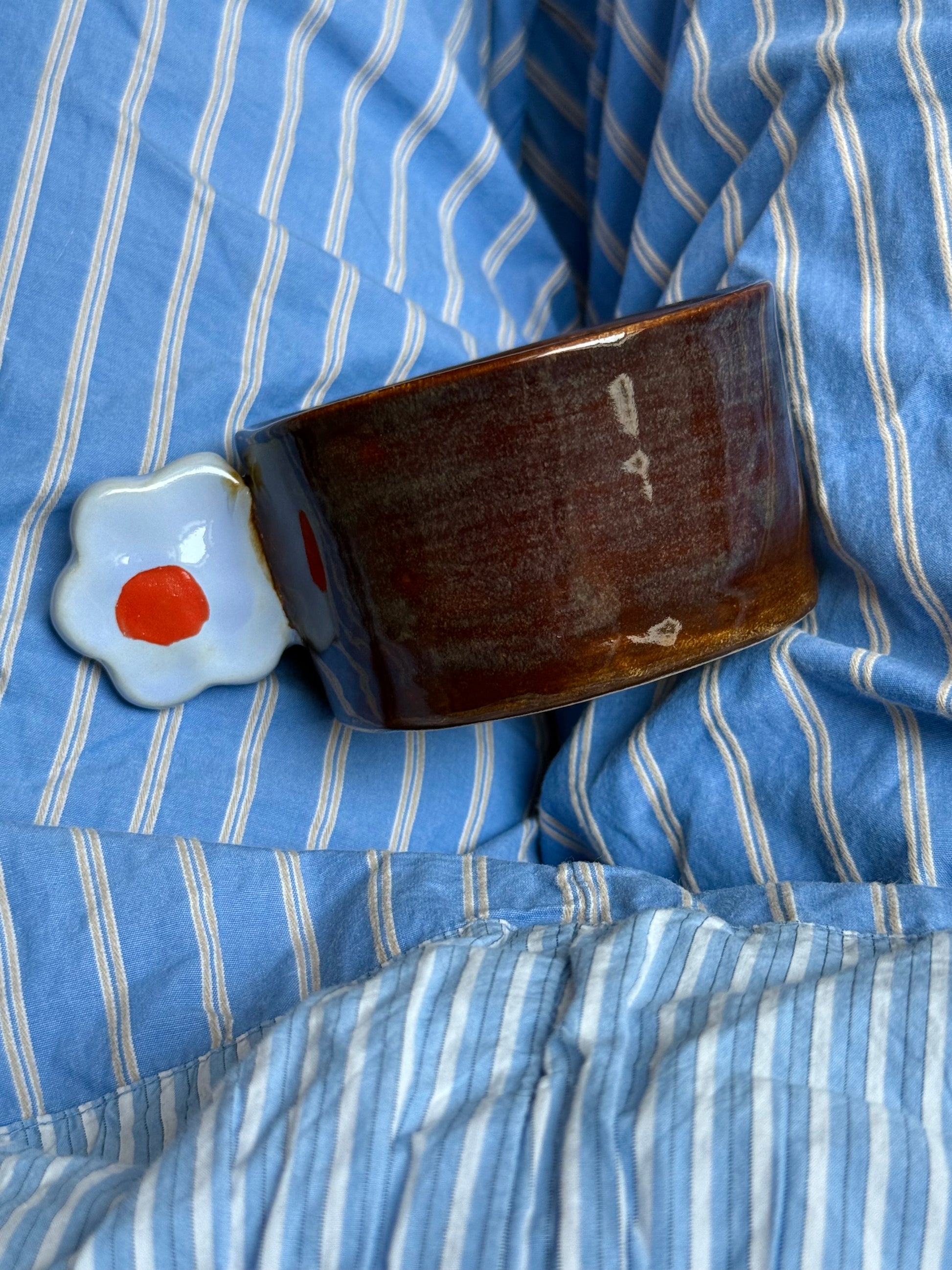 Ceramiczny, ręcznie toczony kubek w głębokim, czekoladowo-miedzianym szkliwie, które pięknie odbija światło i tworzy miękkie, naturalne przejścia kolorów. Jego wyjątkowym akcentem jest ucho w kształcie błękitnego kwiatka :) Idealny do kawy, kakao lub ziół, a jednocześnie świetnie prezentuje się jako dekoracyjny element kuchni