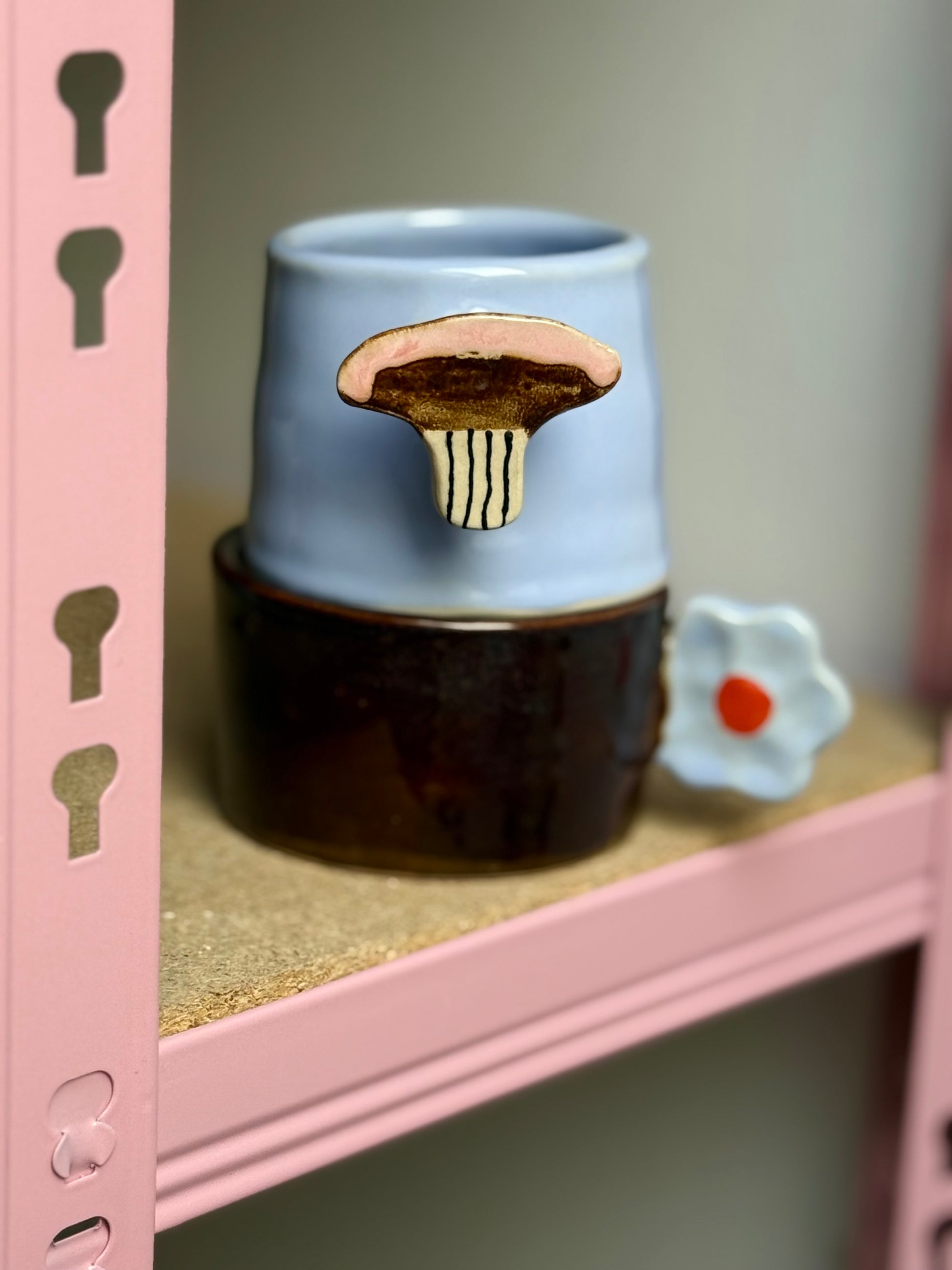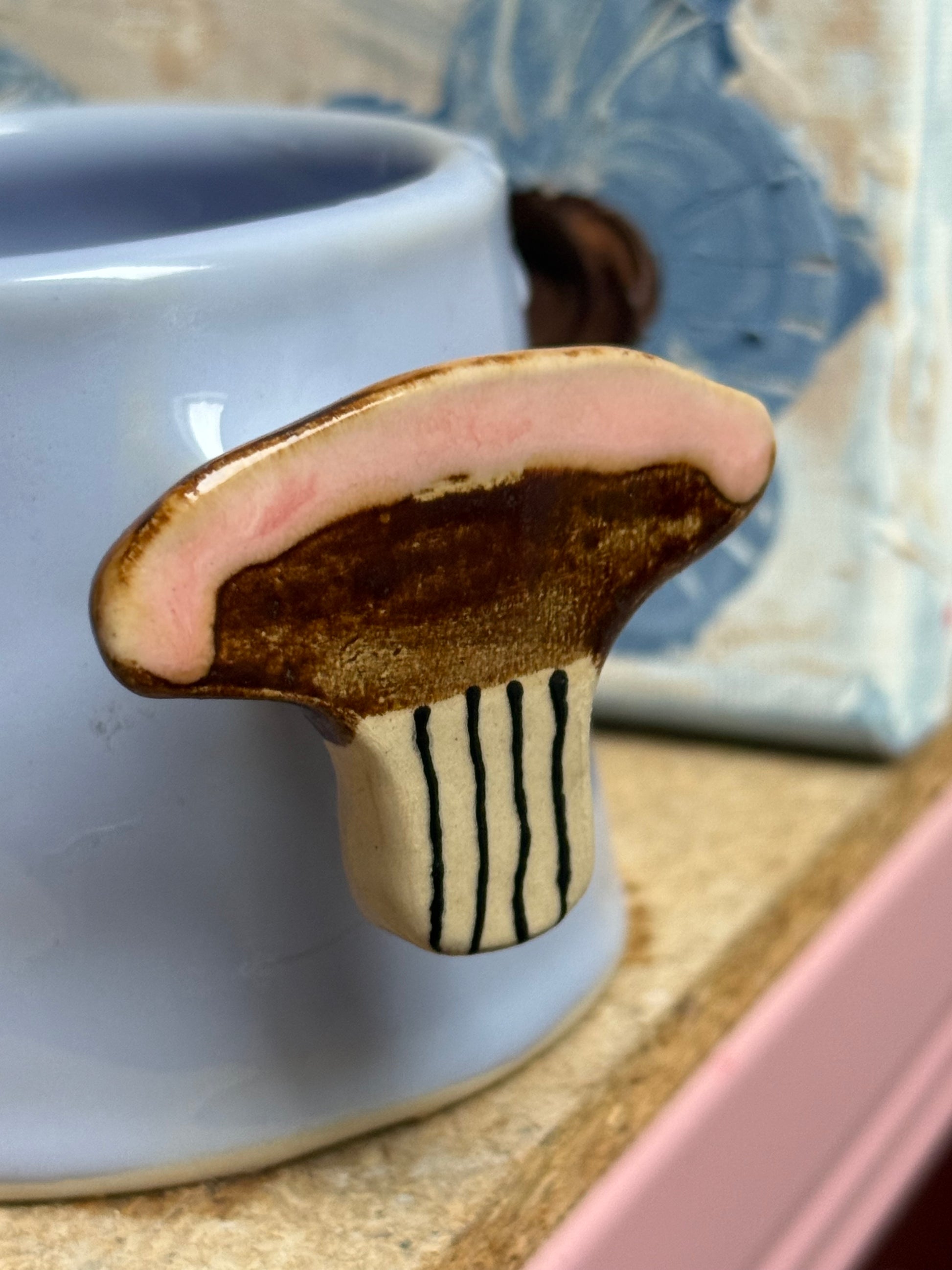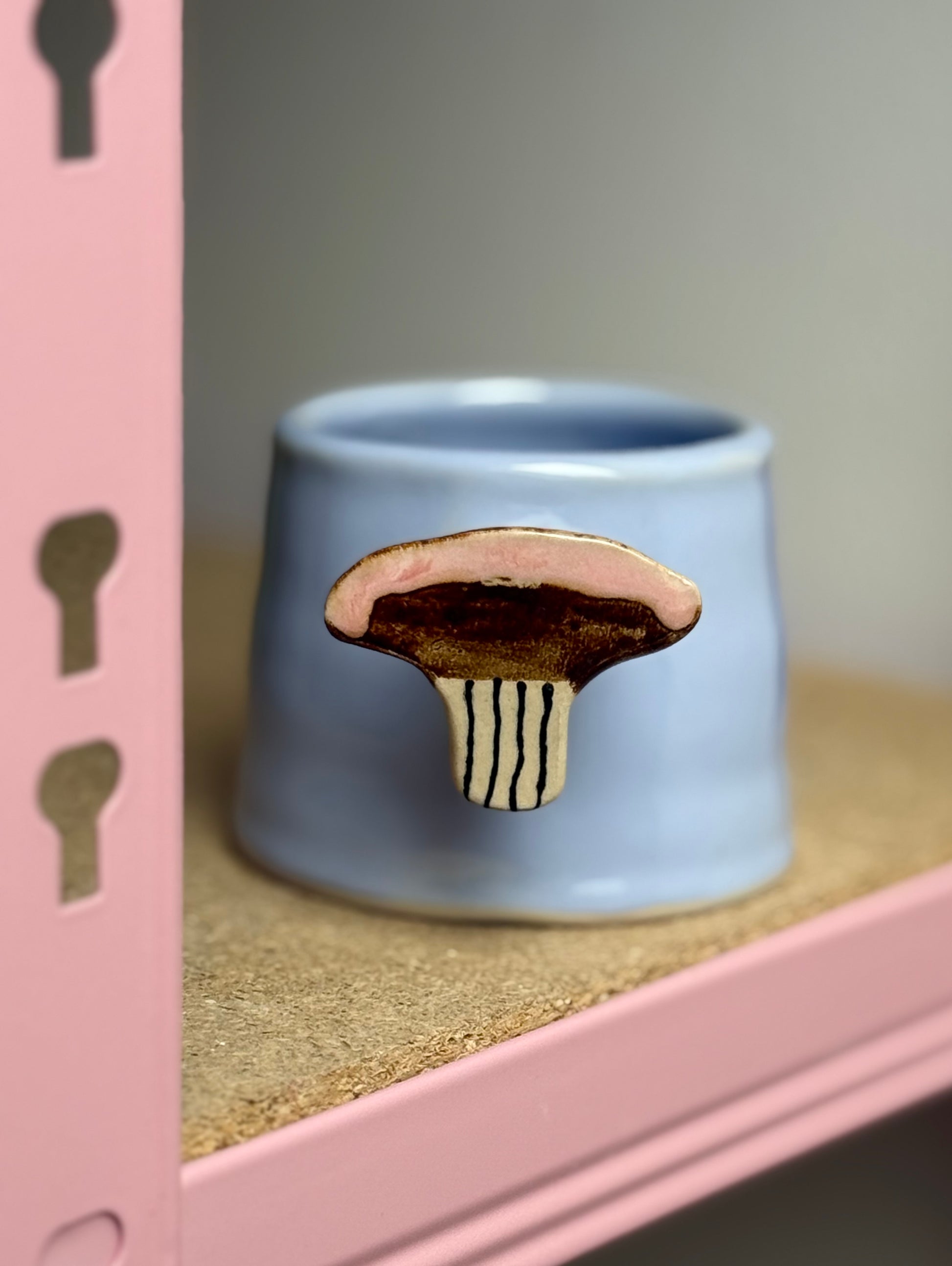 Błękitny kubek ceramiczny, toczony na kole garncarskim i ręcznie malowany. Posiada oryginalny uchwyt w kształcie grzybka :) Kubek na pewno będzie ciekawym, kolorowym akcentem w życiu codziennym a picie z niego gorącego napoju to czysta przyjemność :) Pięknie komponuje się z resztą naczyń z kolekcji tworząc urocze zestawy
