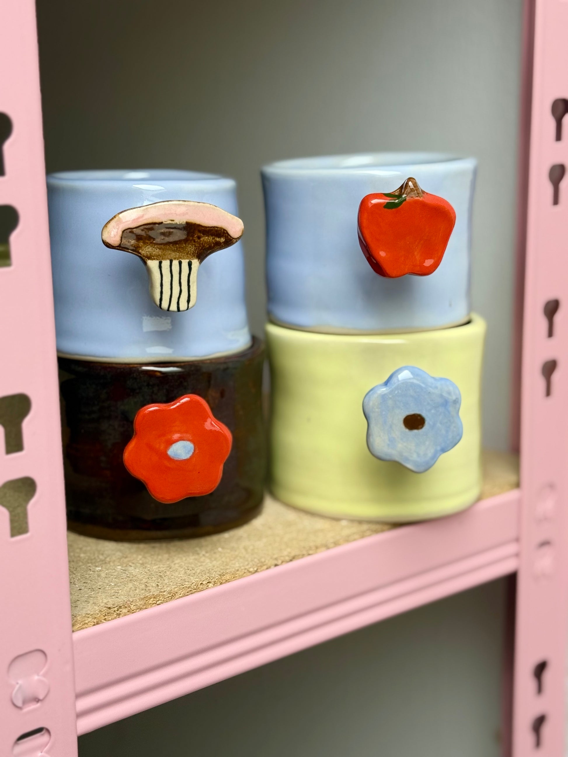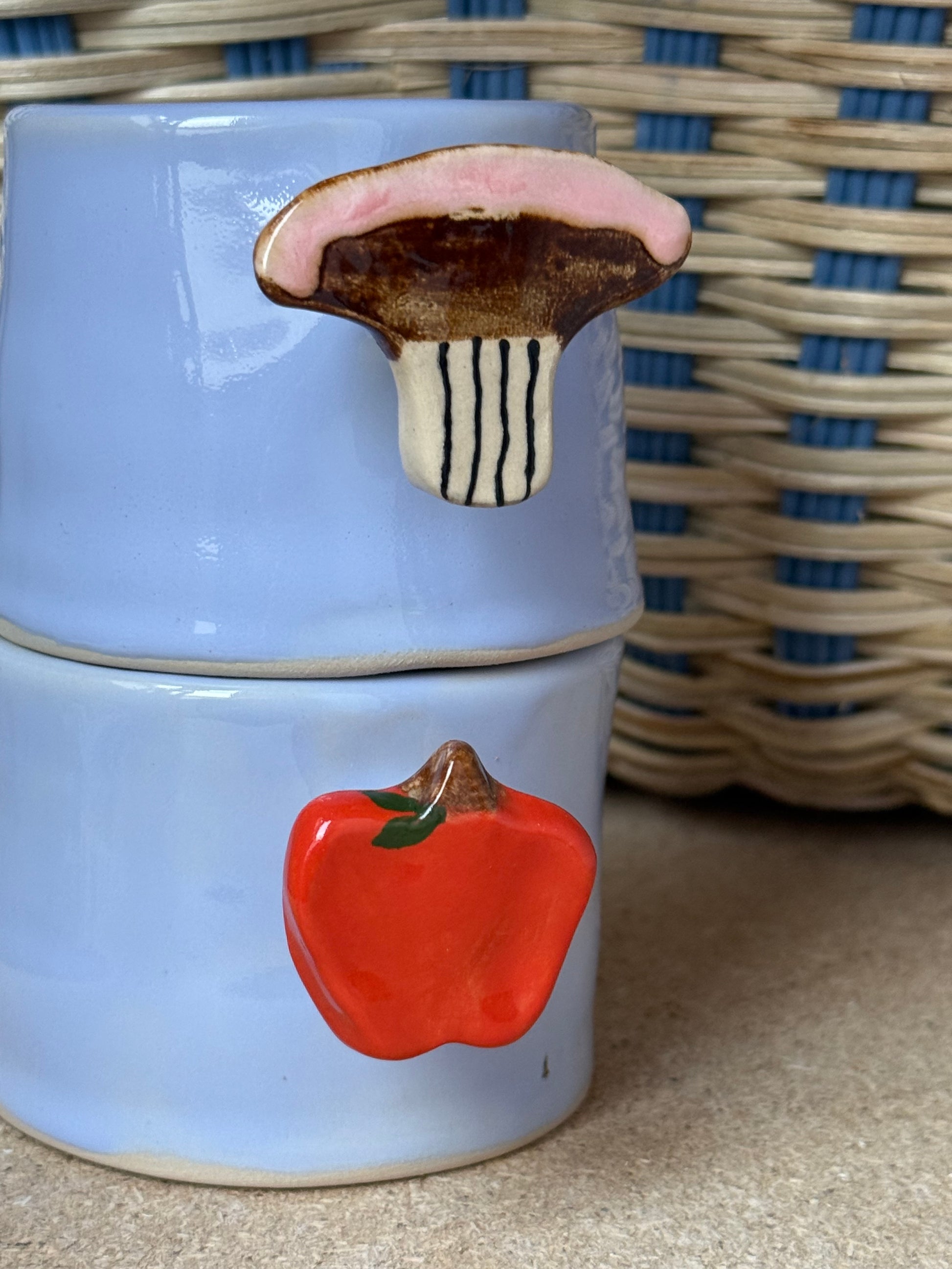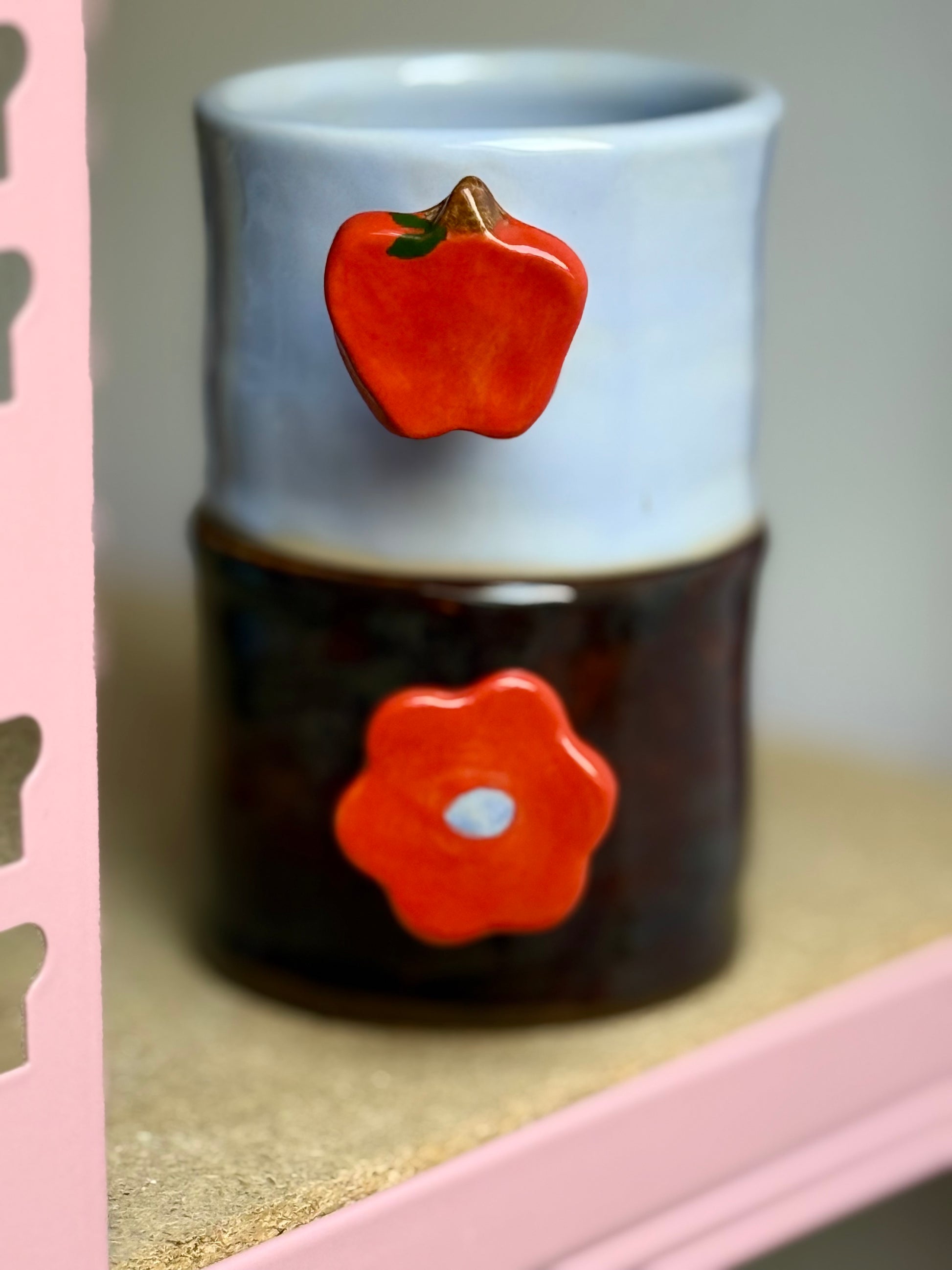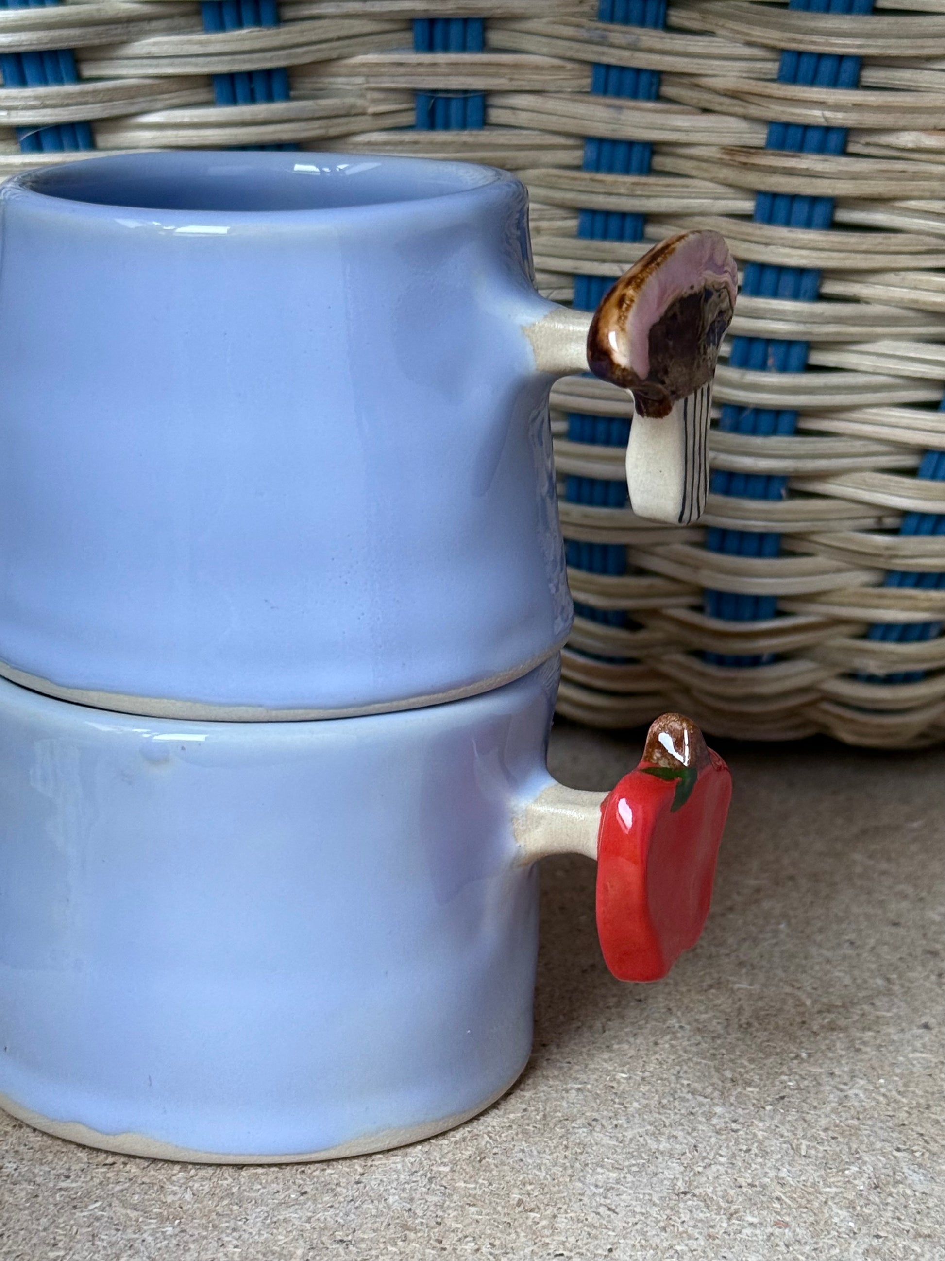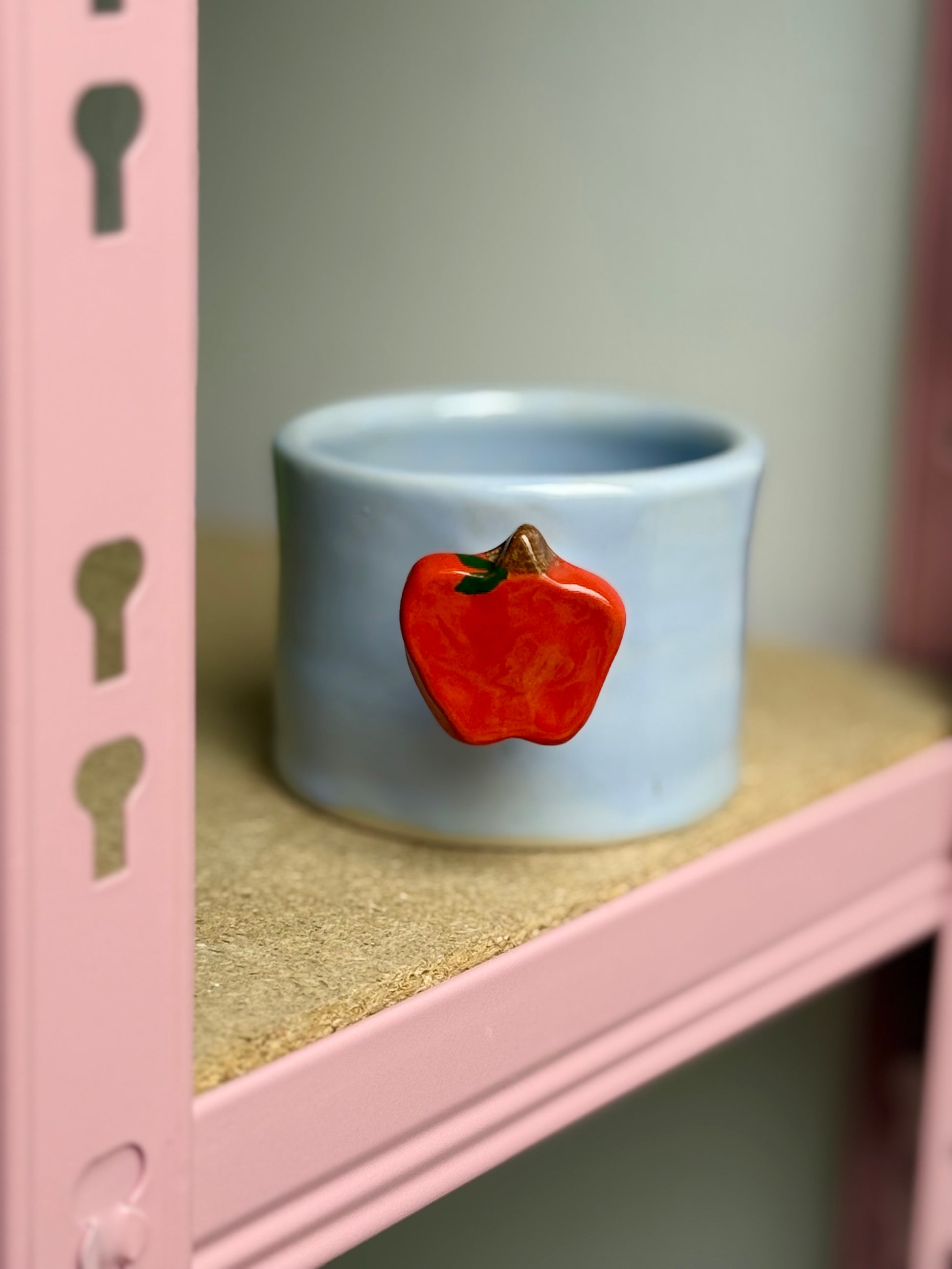 Błękitny kubek ceramiczny z oryginalnym uchwytem w kształcie jabłuszka :) Toczony na kole garncarskim i ręcznie malowany. Kubek na pewno będzie ciekawym, kolorowym akcentem w życiu codziennym a picie z niego gorącego napoju to czysta przyjemność :) Pięknie komponuje się z resztą naczyń z kolekcji tworząc urocze zestawy