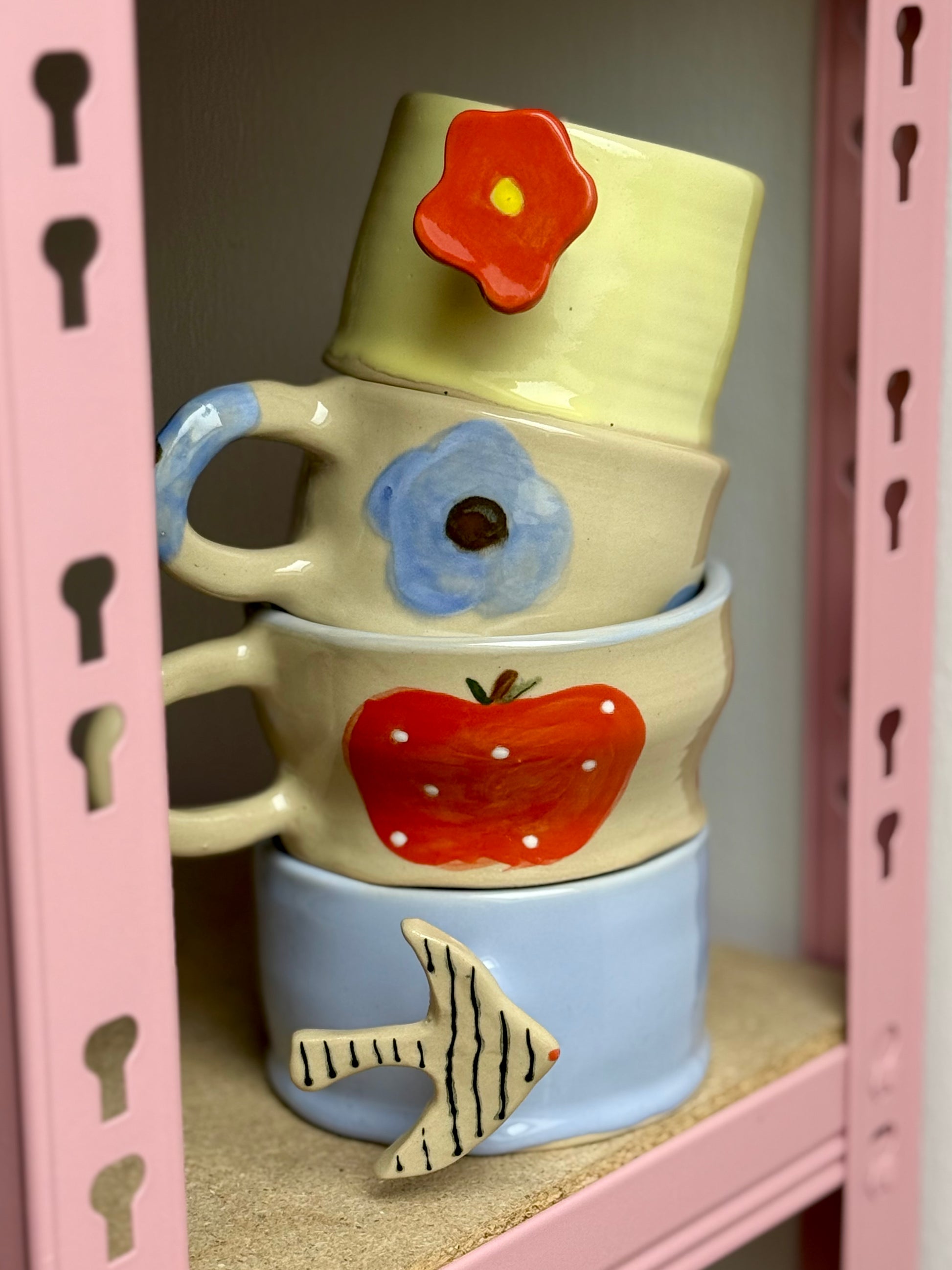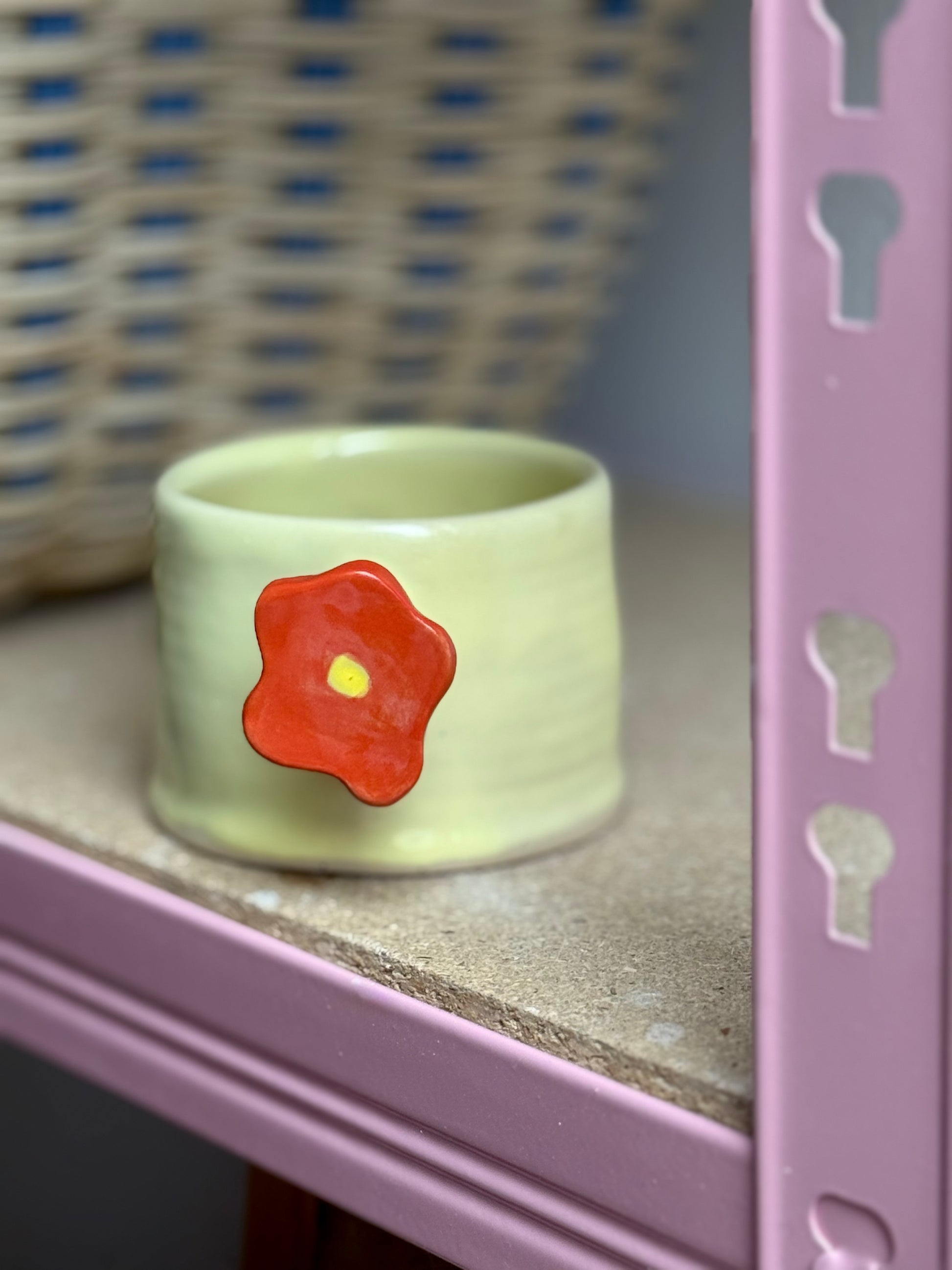 Kubek ceramiczny w masełkowym kolorze z oryginalnym uchwytem w kształcie kwiatka o intensywnej czerwonej barwie :) Kubek na pewno będzie ciekawym, kolorowym akcentem w życiu codziennym a picie z niego gorącego napoju to czysta przyjemność :) Pięknie komponuje się z resztą naczyń z kolekcji tworząc urocze zestawy