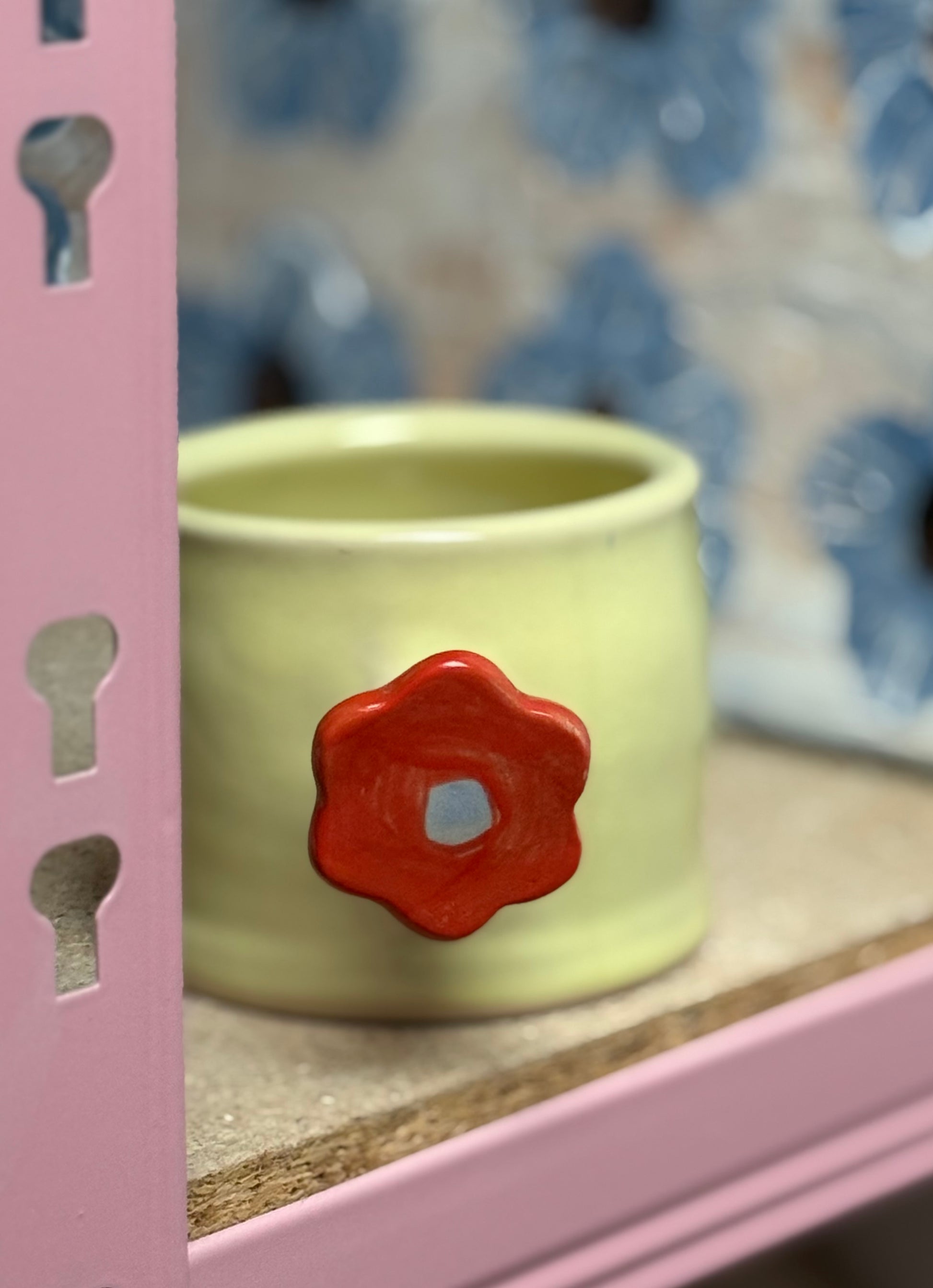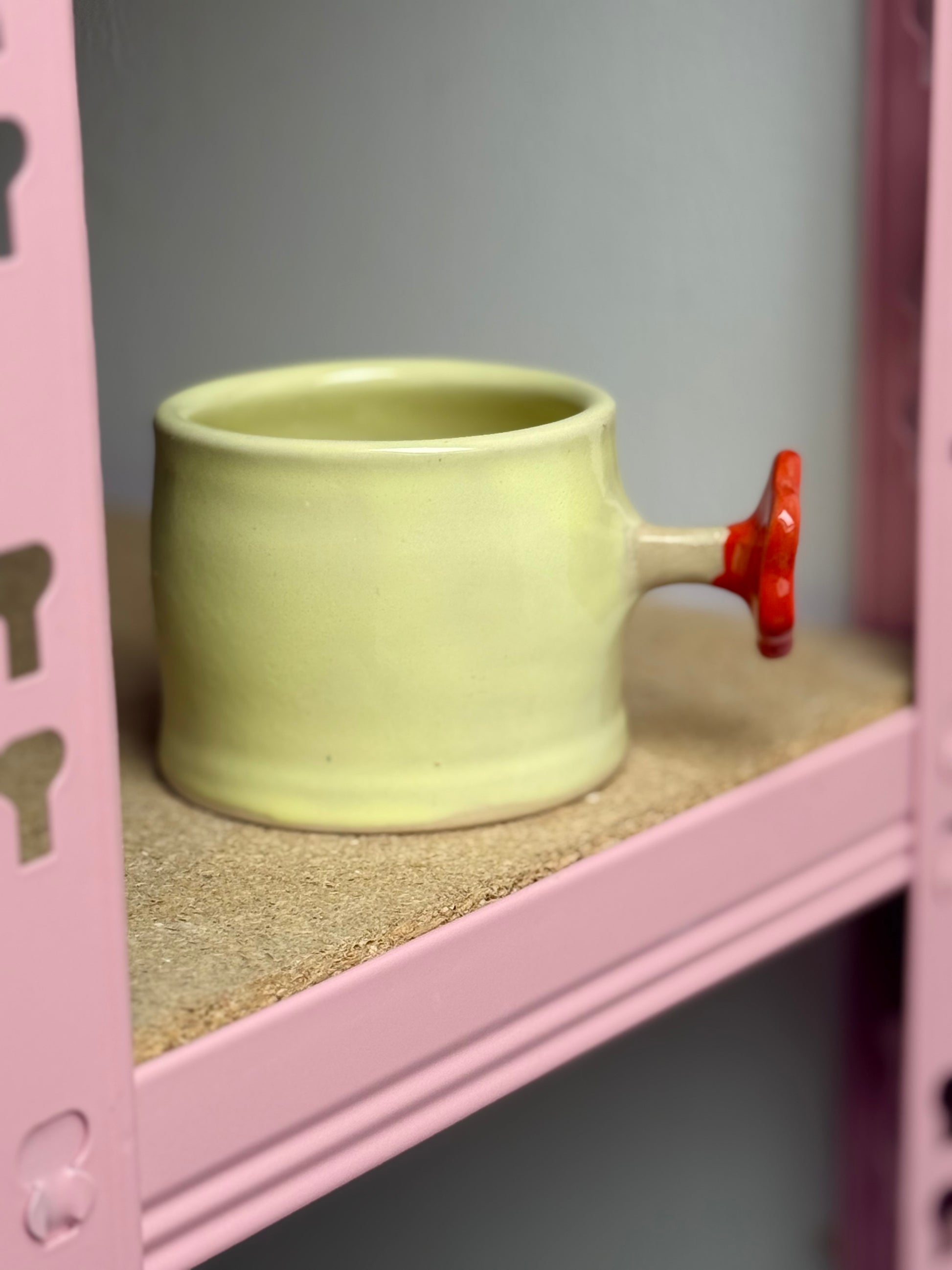 Kubek ceramiczny w masełkowym kolorze z oryginalnym uchwytem w kształcie kwiatka o intensywnej czerwonej barwie :) Kubek na pewno będzie ciekawym, kolorowym akcentem w życiu codziennym a picie z niego gorącego napoju to czysta przyjemność :) Pięknie komponuje się z resztą naczyń z kolekcji tworząc urocze zestawy