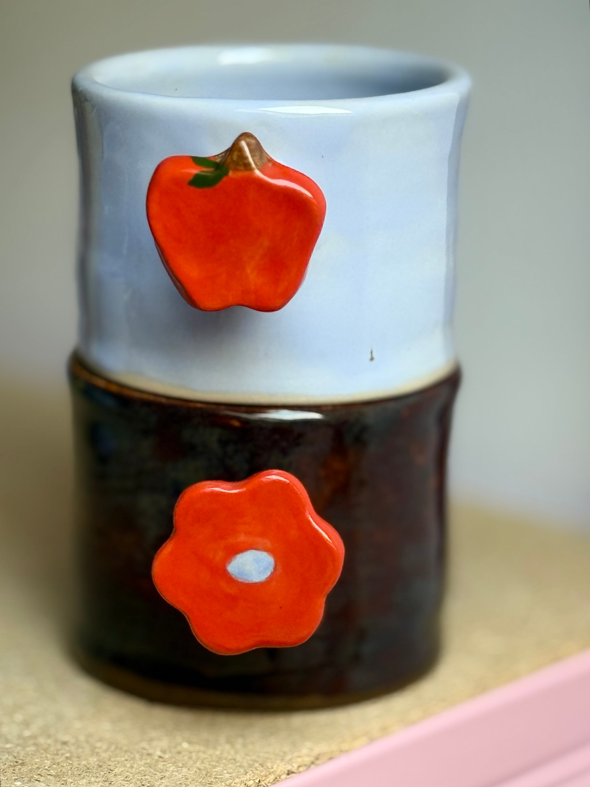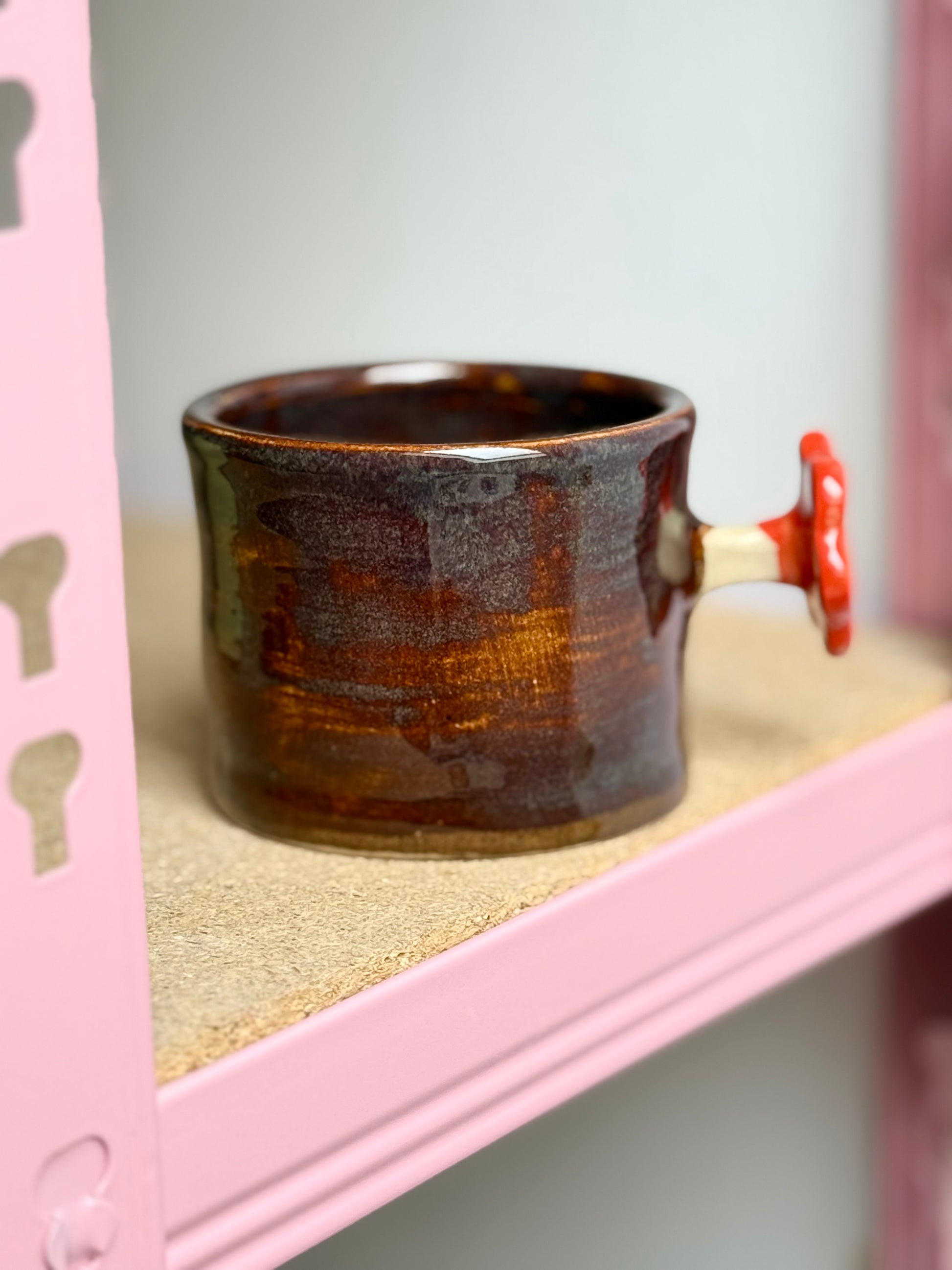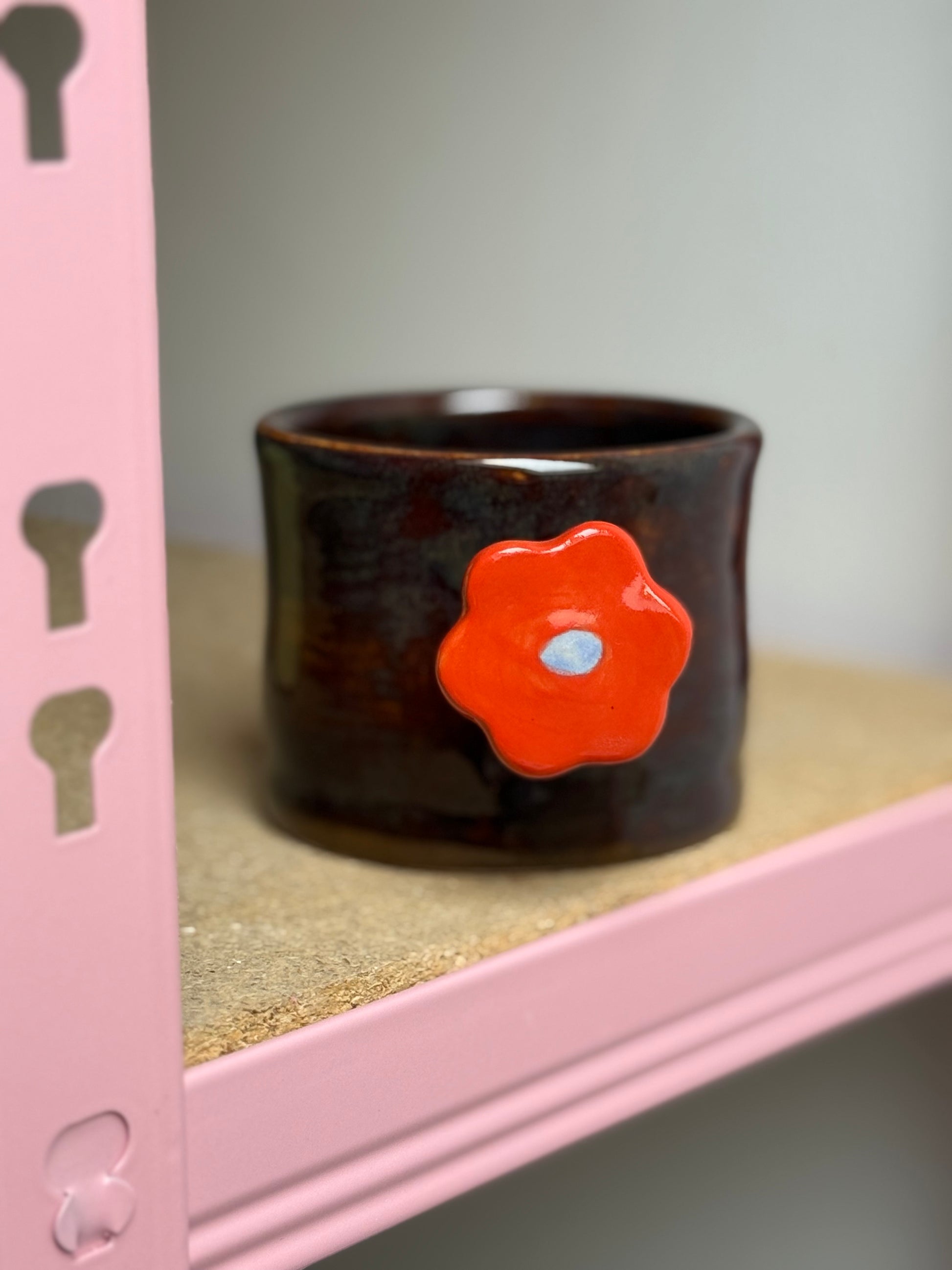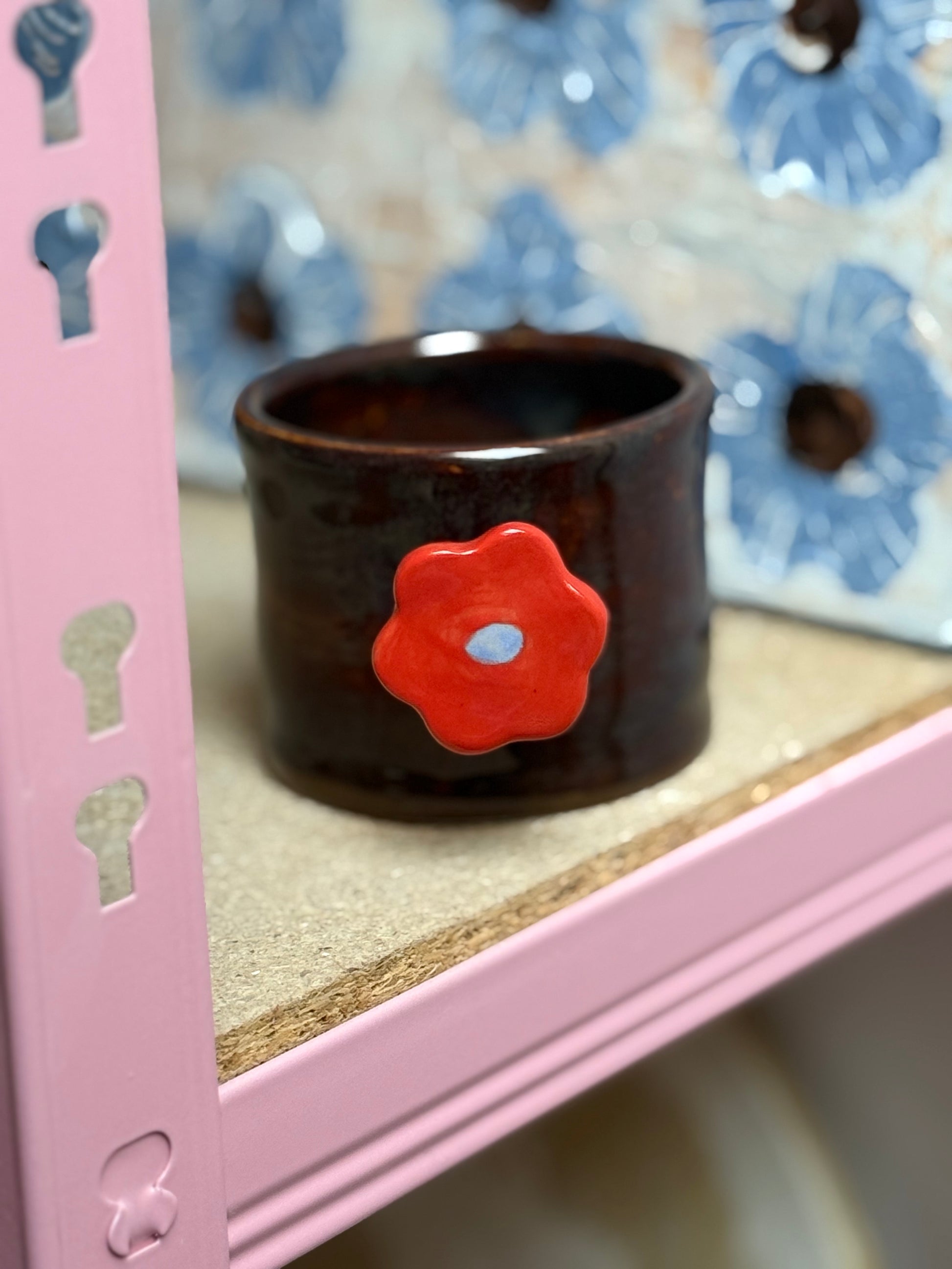 Kubek ceramiczny w czekoladowym kolorze z oryginalnym uchwytem w kształcie kwiatka o intensywnej czerwonej barwie :) Kubek na pewno będzie ciekawym, kolorowym akcentem w życiu codziennym a picie z niego gorącego napoju to czysta przyjemność :) Pięknie komponuje się z resztą naczyń z kolekcji tworząc urocze zestawy
