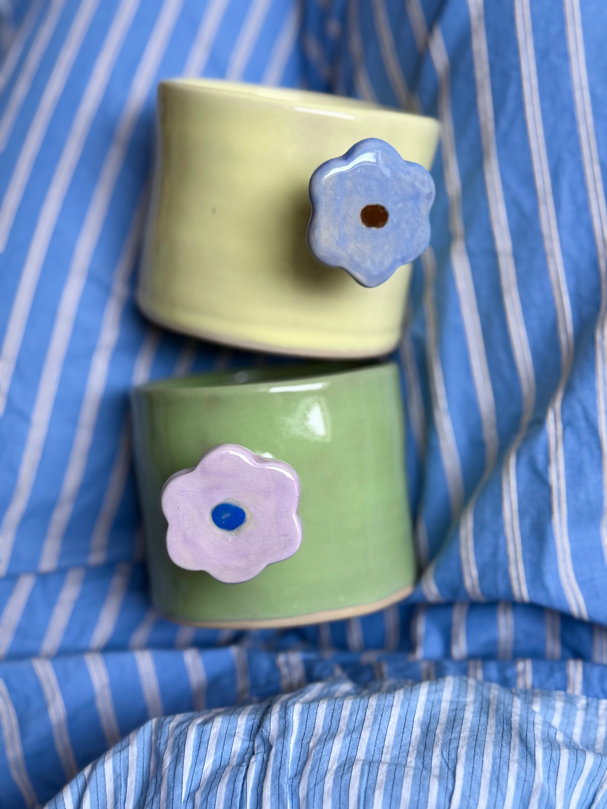 Kubek ceramiczny w masełkowym kolorze z oryginalnym uchwytem w kształcie kwiatka. Kubek na pewno będzie ciekawym, kolorowym akcentem w życiu codziennym a picie z niego gorącego napoju to czysta przyjemność :) Pięknie komponuje się z resztą naczyń z kolekcji tworząc urocze zestawy