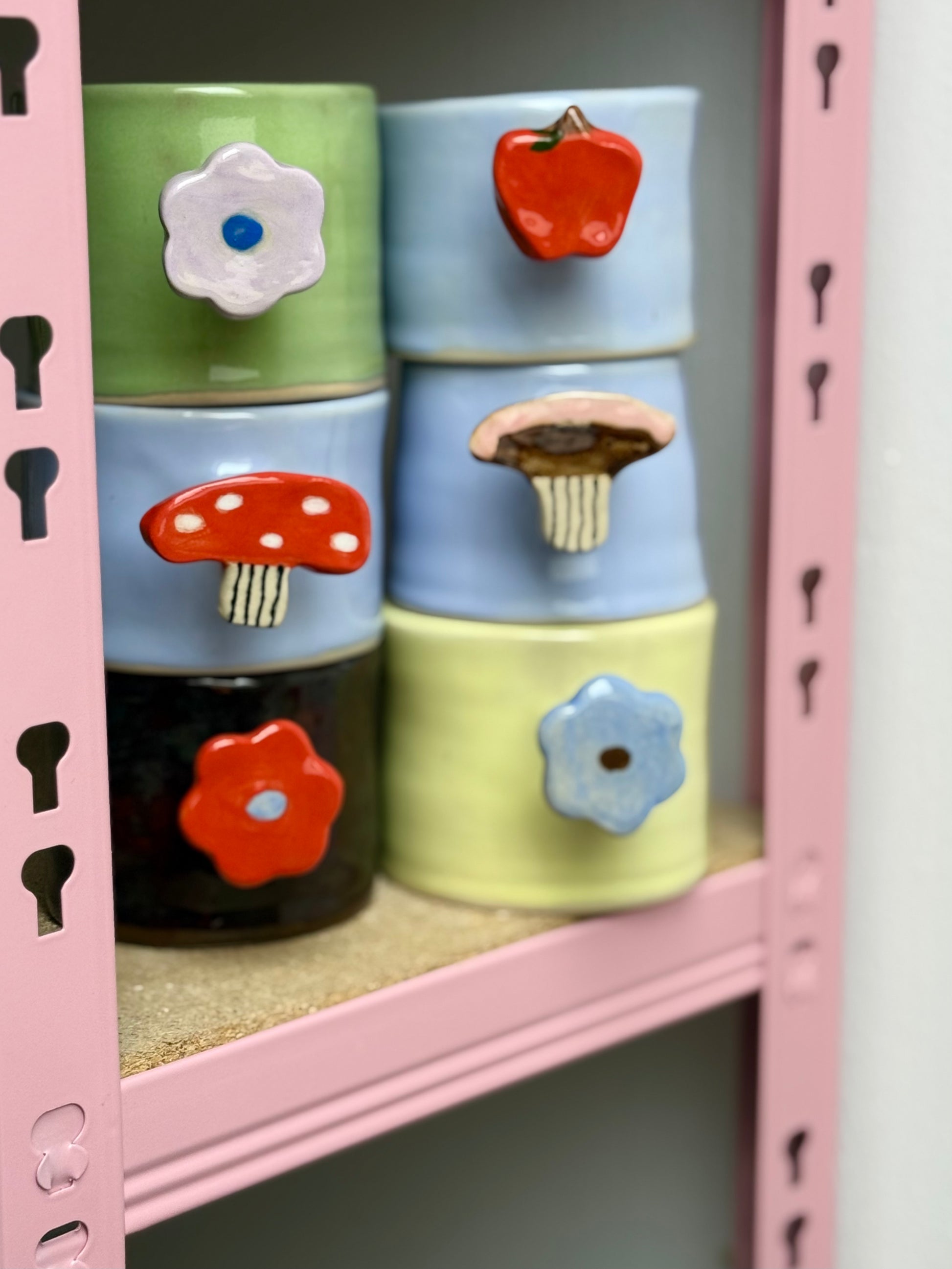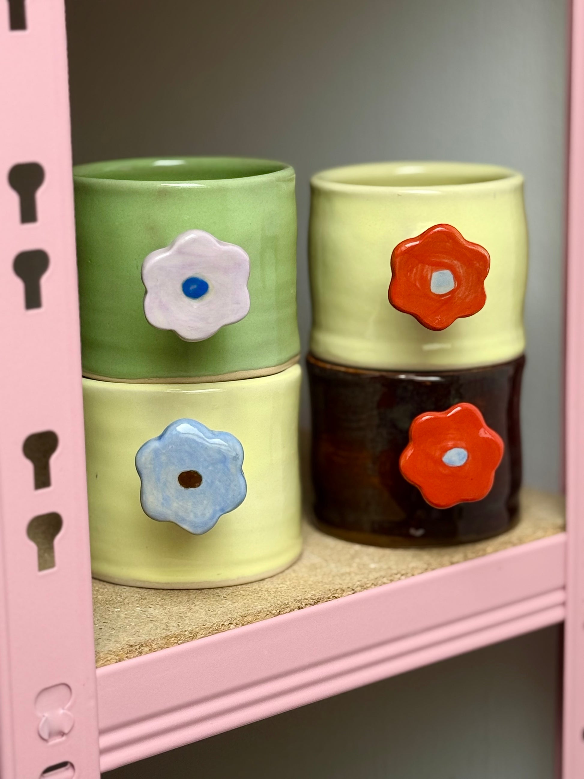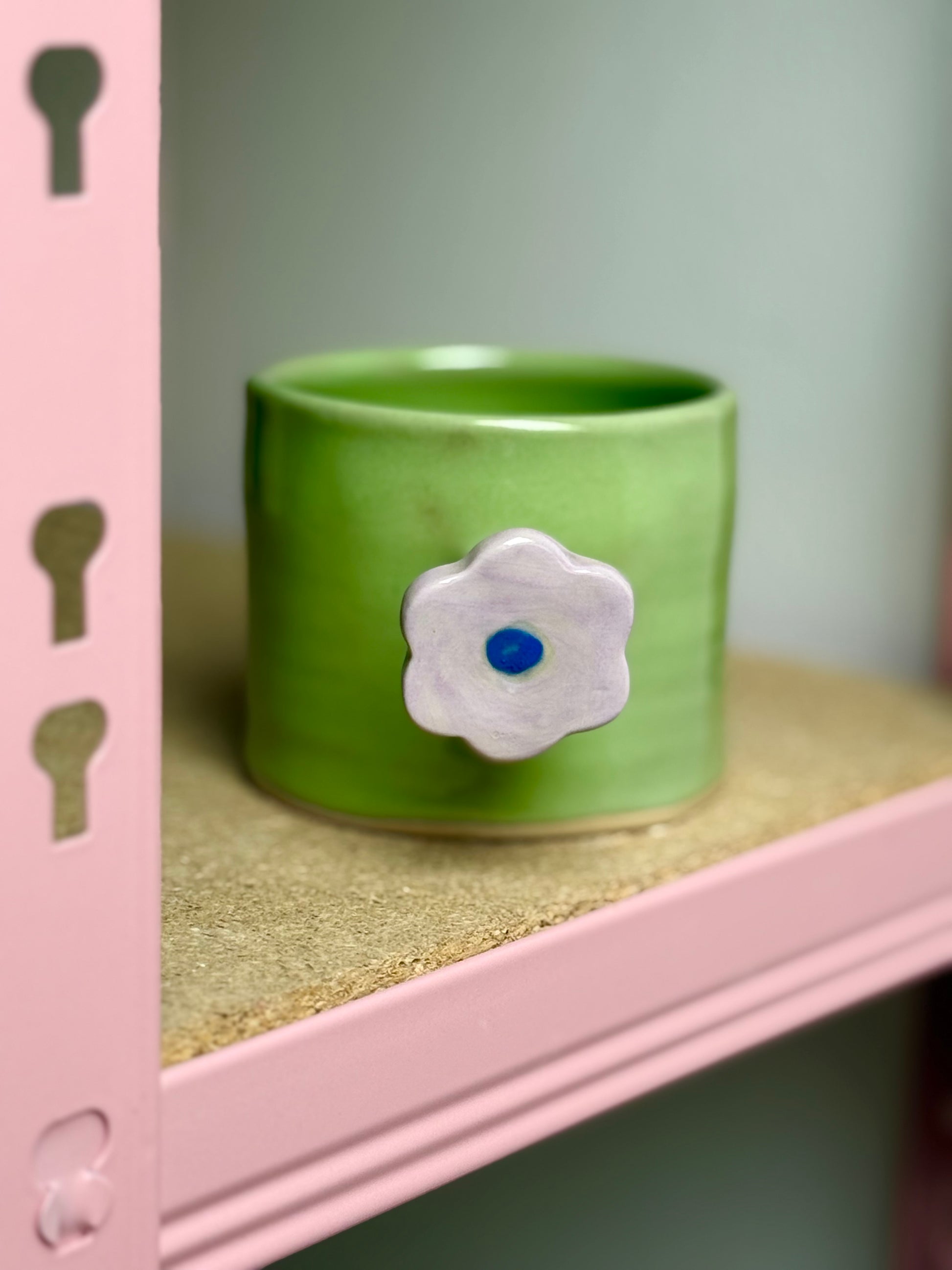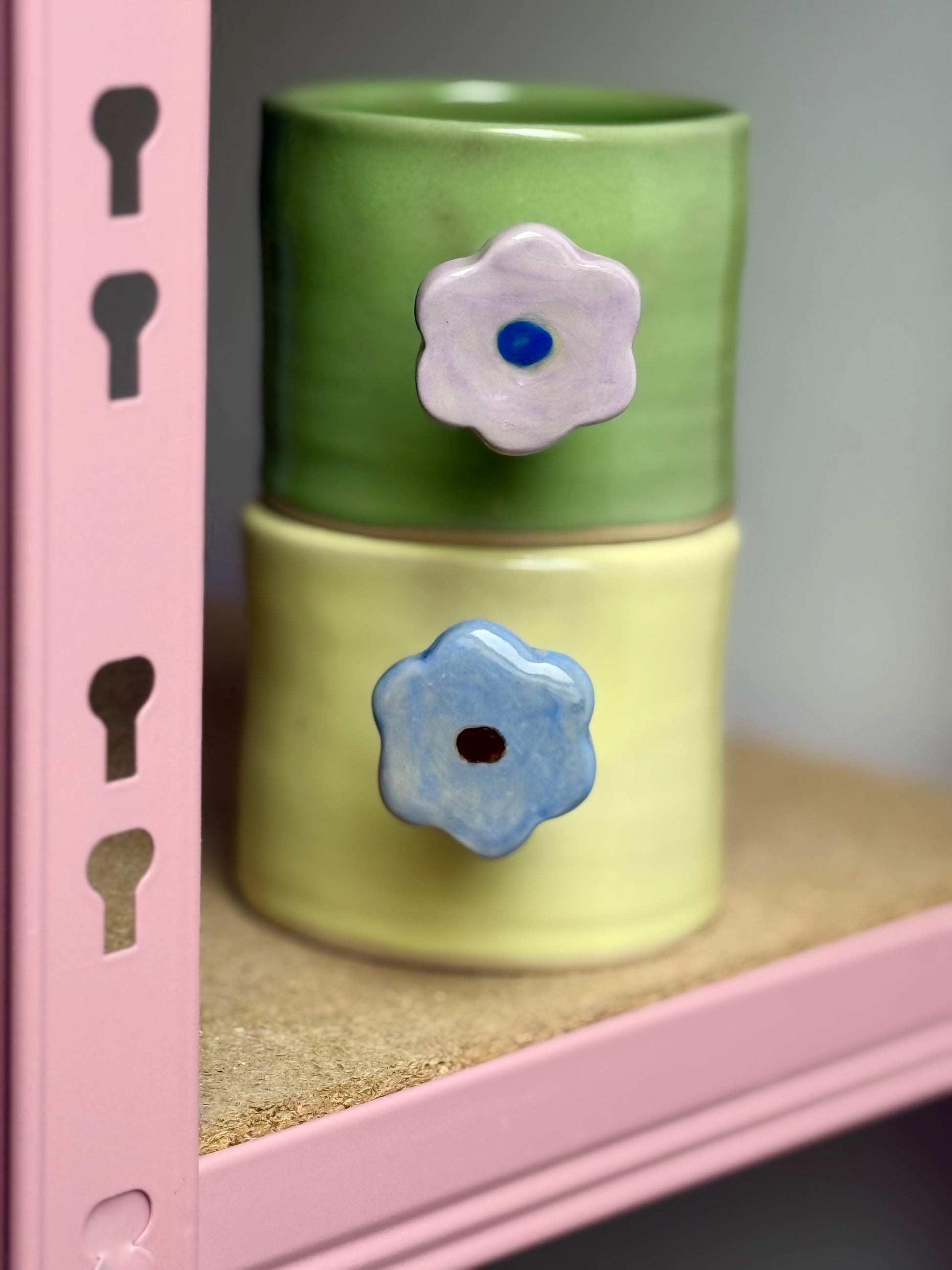 Kubek ceramiczny w jabłuszkowym kolorze z oryginalnym uchwytem w kształcie kwiatka :) Kubek na pewno będzie ciekawym, kolorowym akcentem w życiu codziennym a picie z niego gorącego napoju to czysta przyjemność :) Pięknie komponuje się z resztą naczyń z kolekcji tworząc urocze zestawy