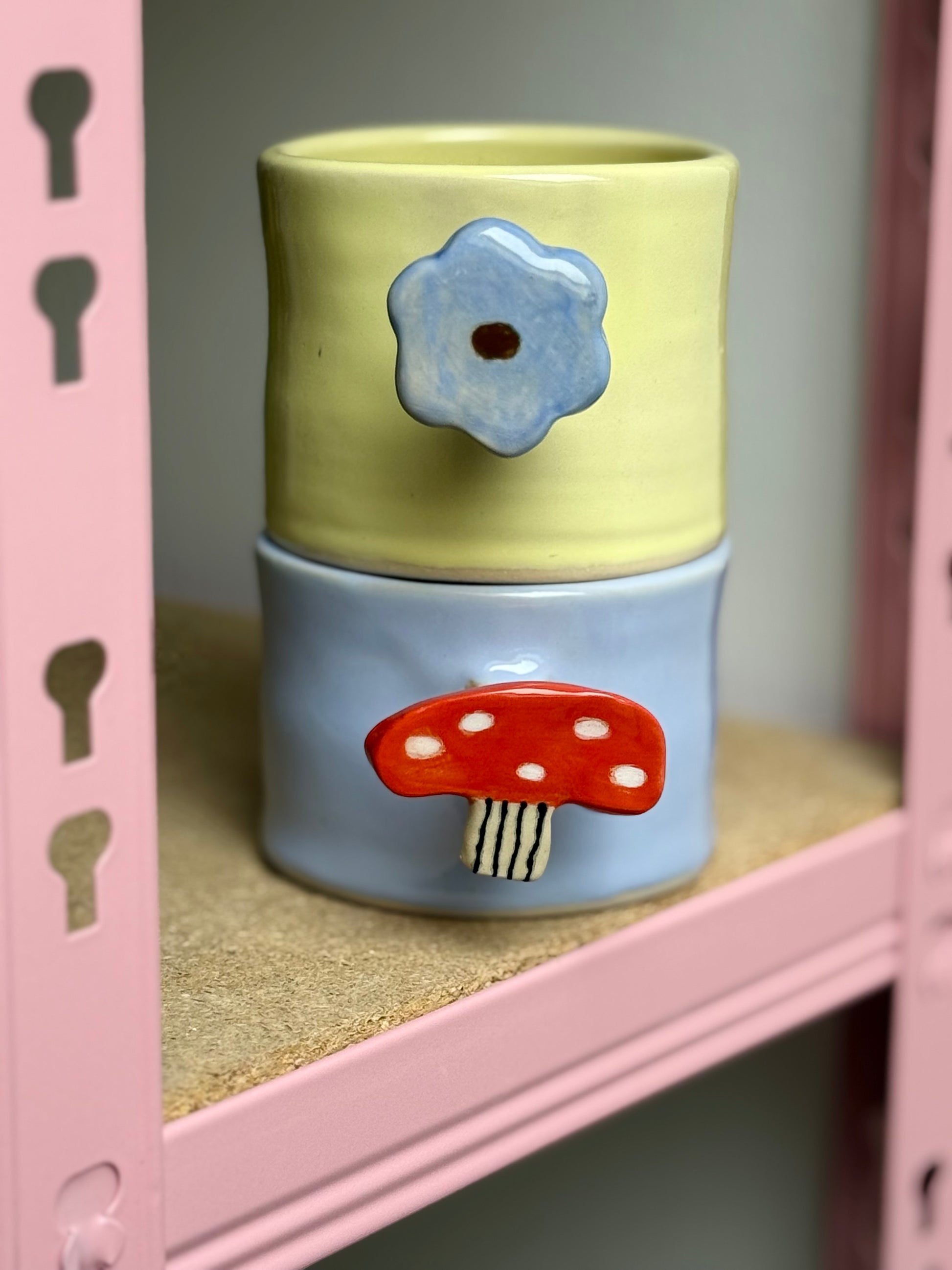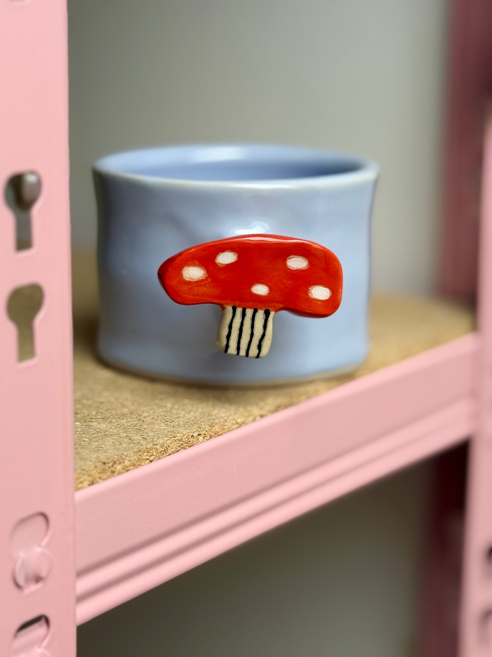 Błękitny kubek ceramiczny z oryginalnym uchwytem w kształcie uroczego muchomora. Toczony na kole garncarskim i ręcznie malowany. Kubek na pewno będzie ciekawym, kolorowym akcentem w życiu codziennym a picie z niego gorącego napoju to czysta przyjemność :) Pięknie komponuje się z resztą naczyń z kolekcji tworząc urocze zestawy