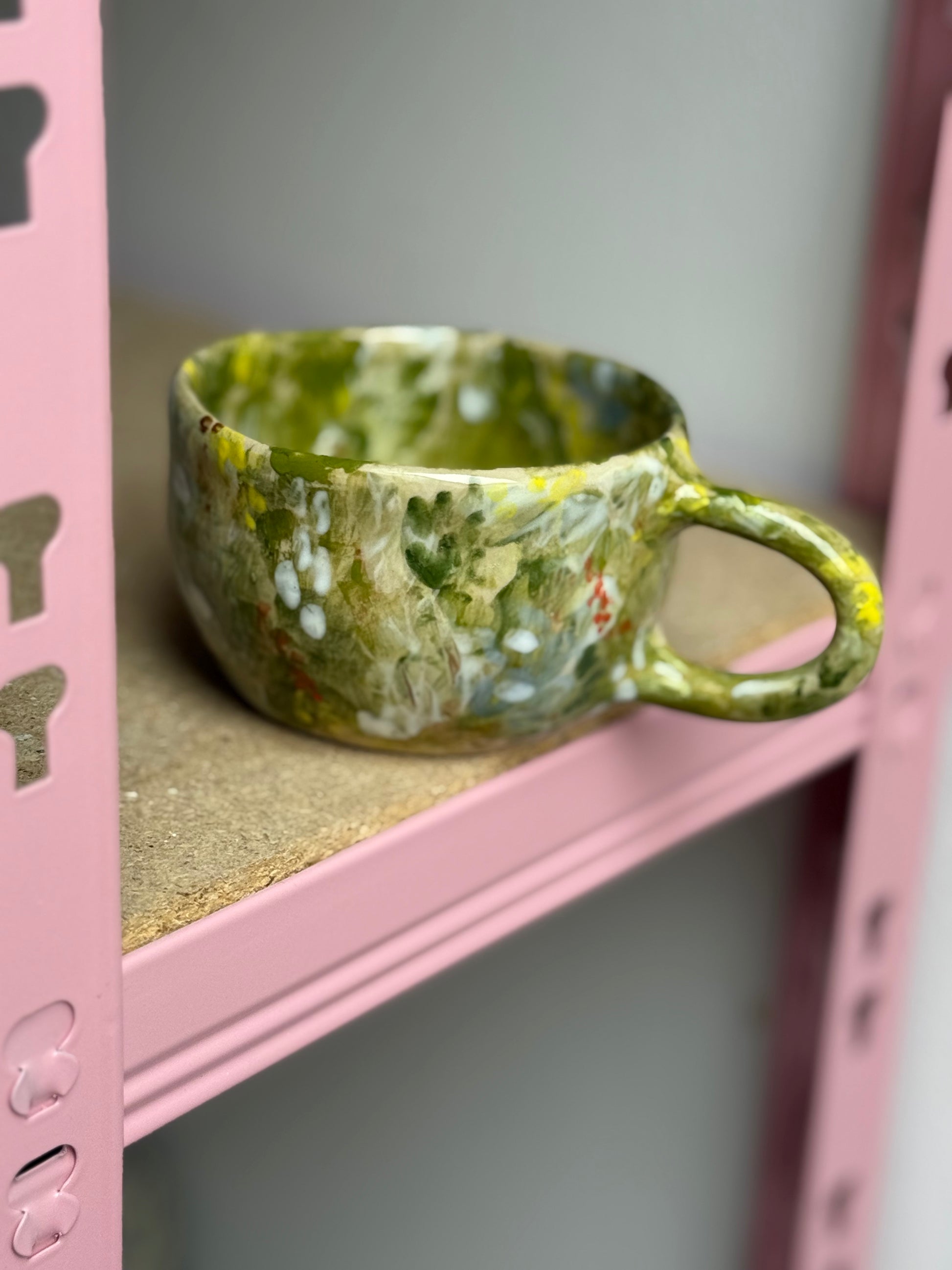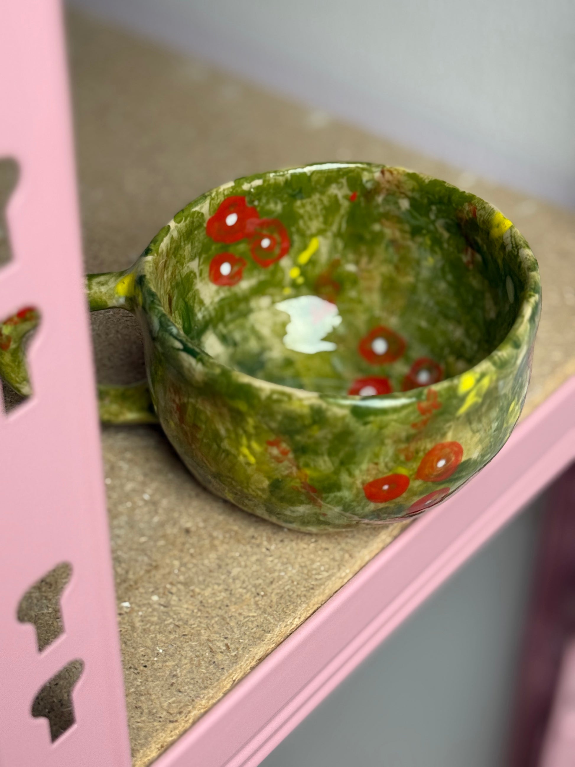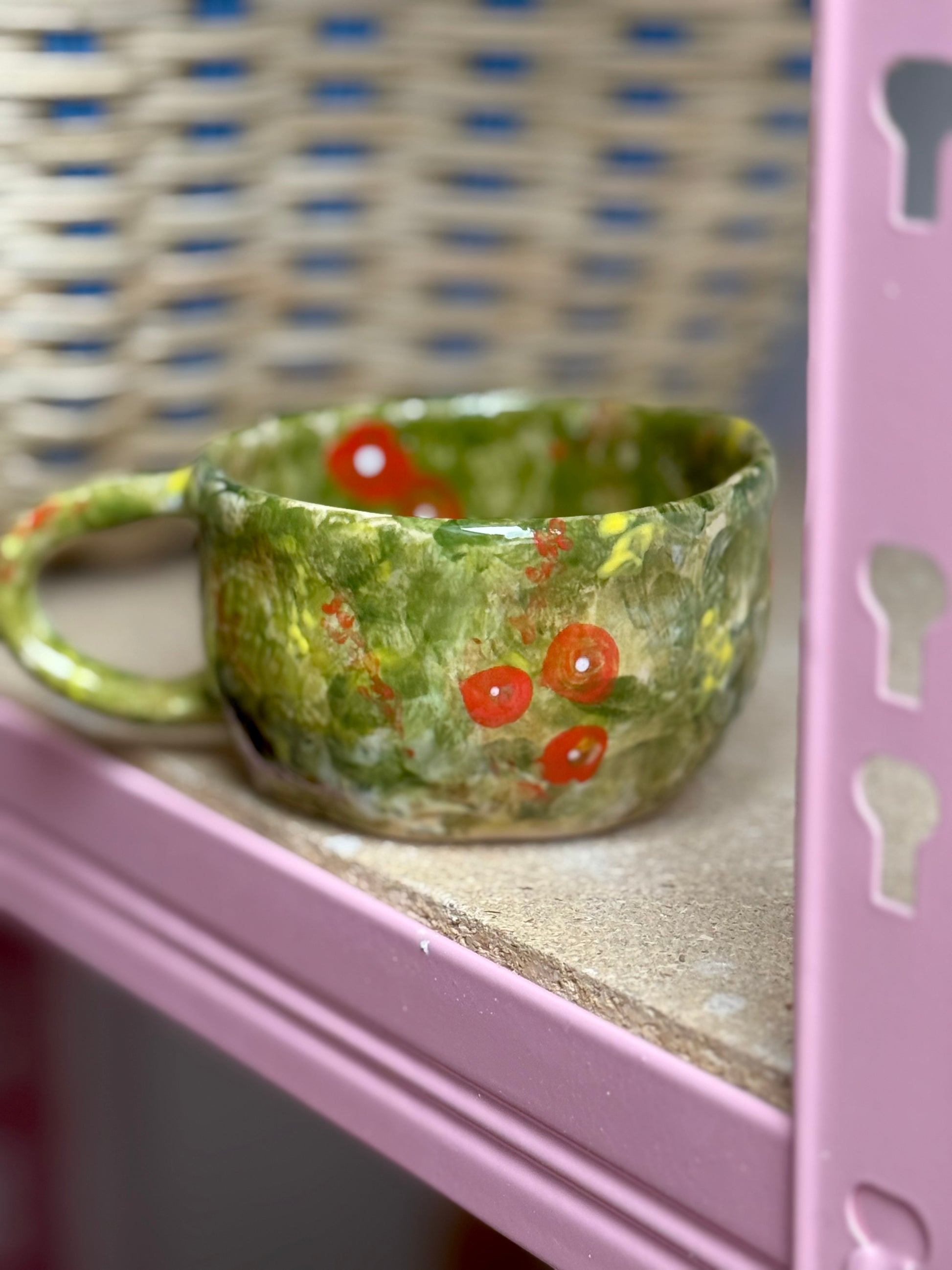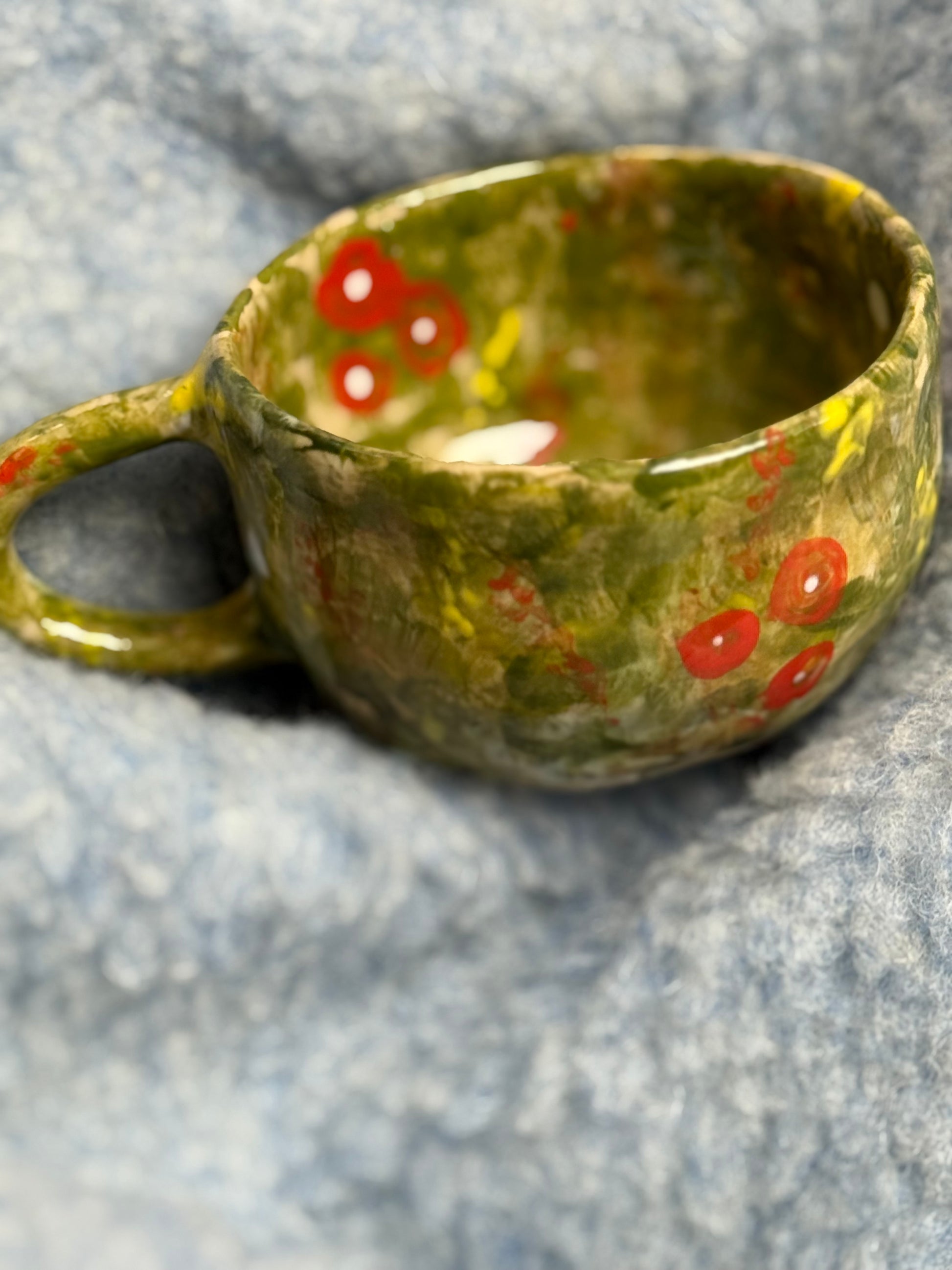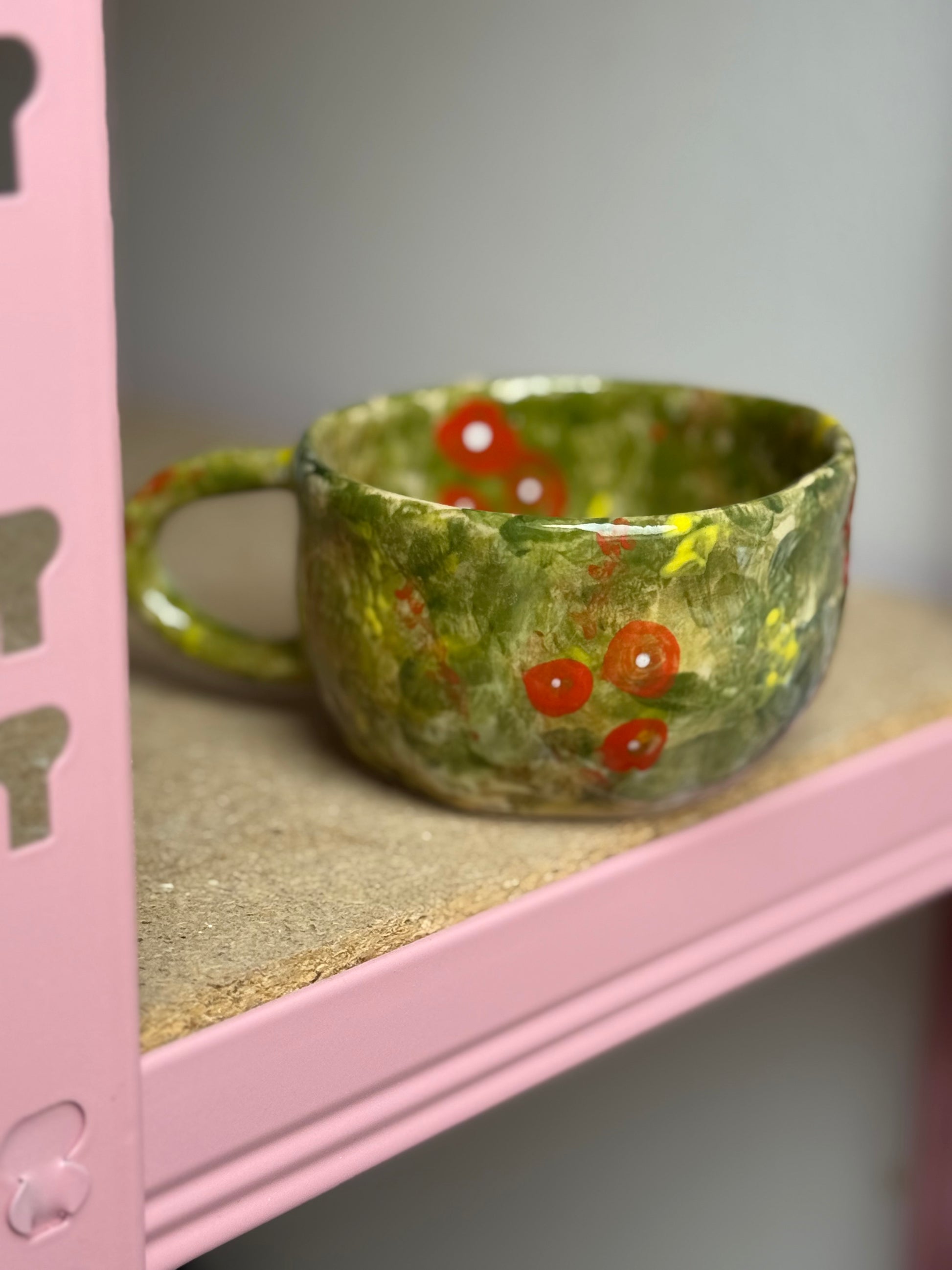Toczony na kole garncarskim i ręcznie malowany. Zielone tło przypomina letnią łąkę, na której wyrastają delikatne czerwone kwiaty. Jest to kubek, który wprowadza spokój i ciepło do codziennych rytuałów