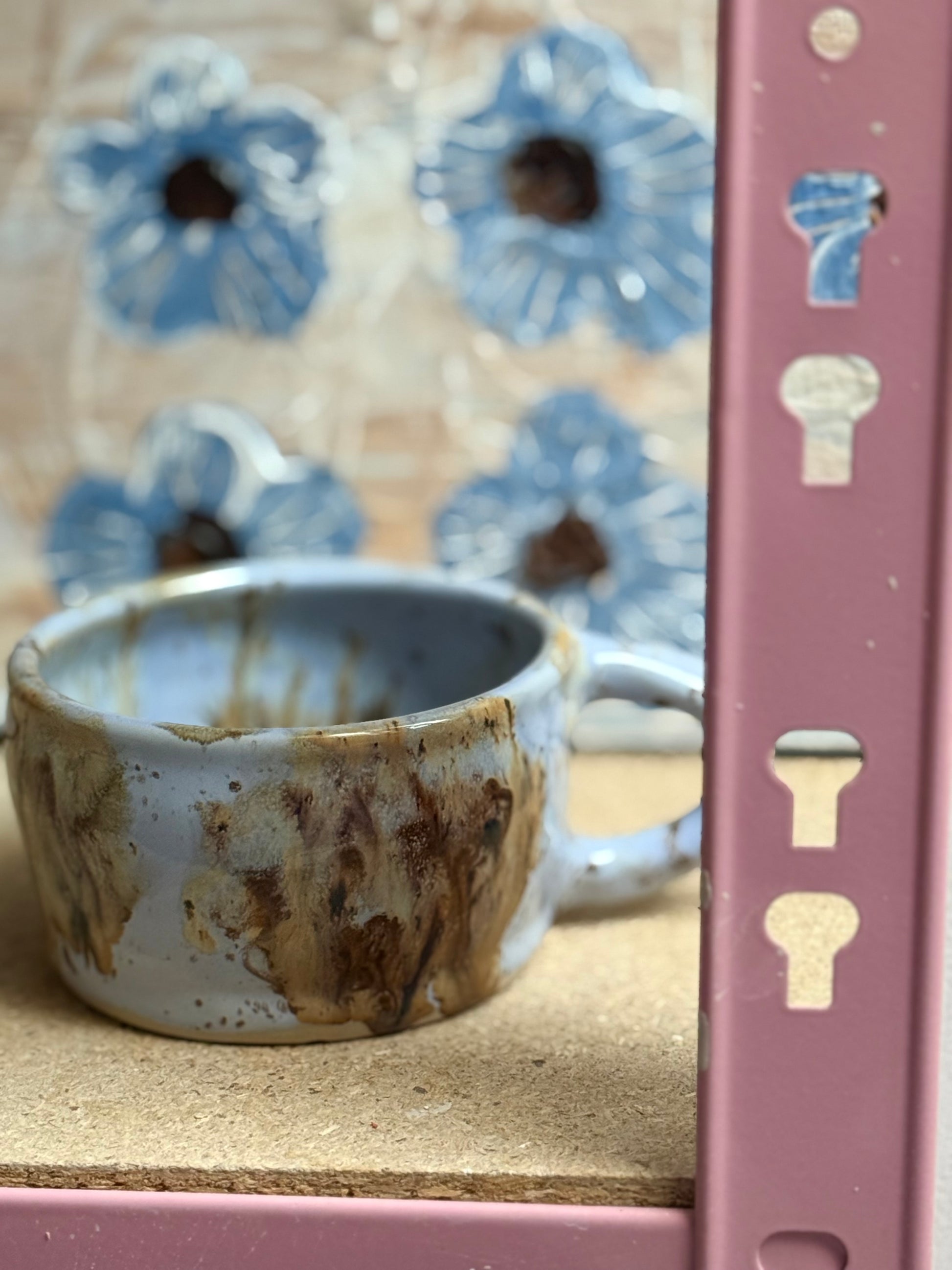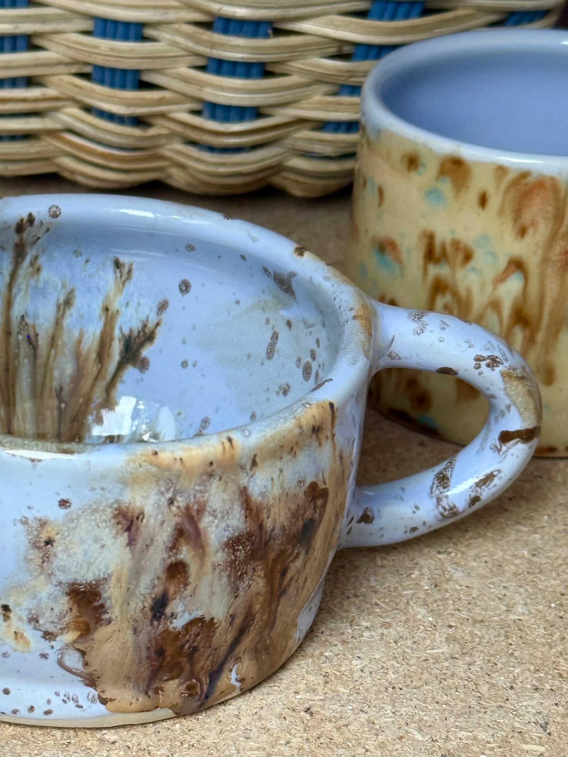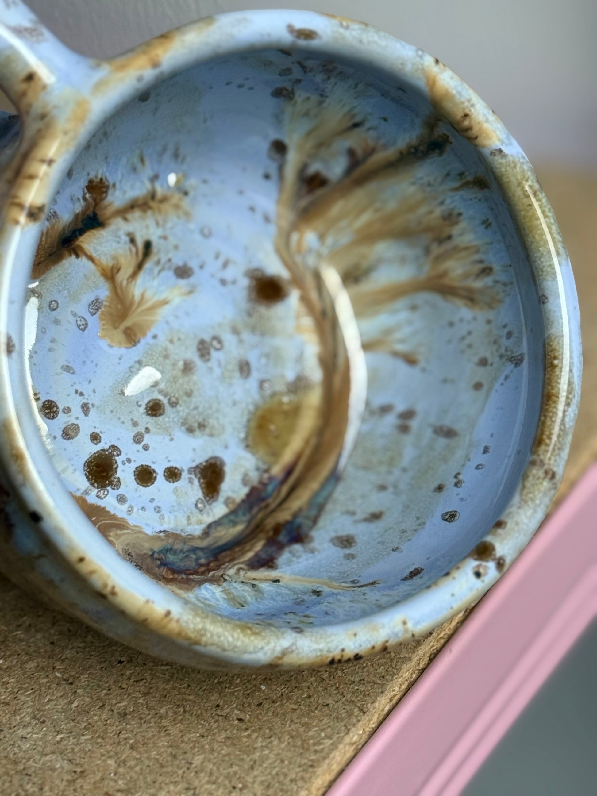 Ręcznie toczony kubek o unikatowym szkliwieniu, w którym spotykają się chłodne odcienie błękitu z ciepłymi, żywicznymi smugami brązu i karmelu. Każdy fragment jest niepowtarzalną kompozycją. Idealny do aromatycznej kawy czy gorącego kakao :)